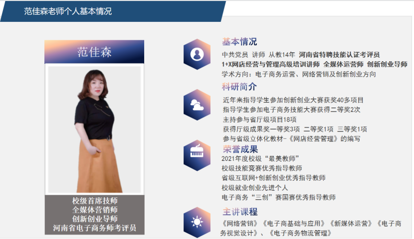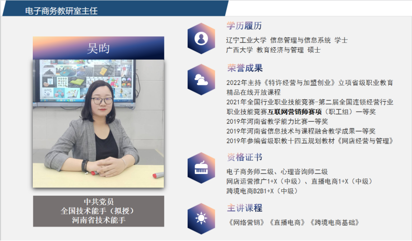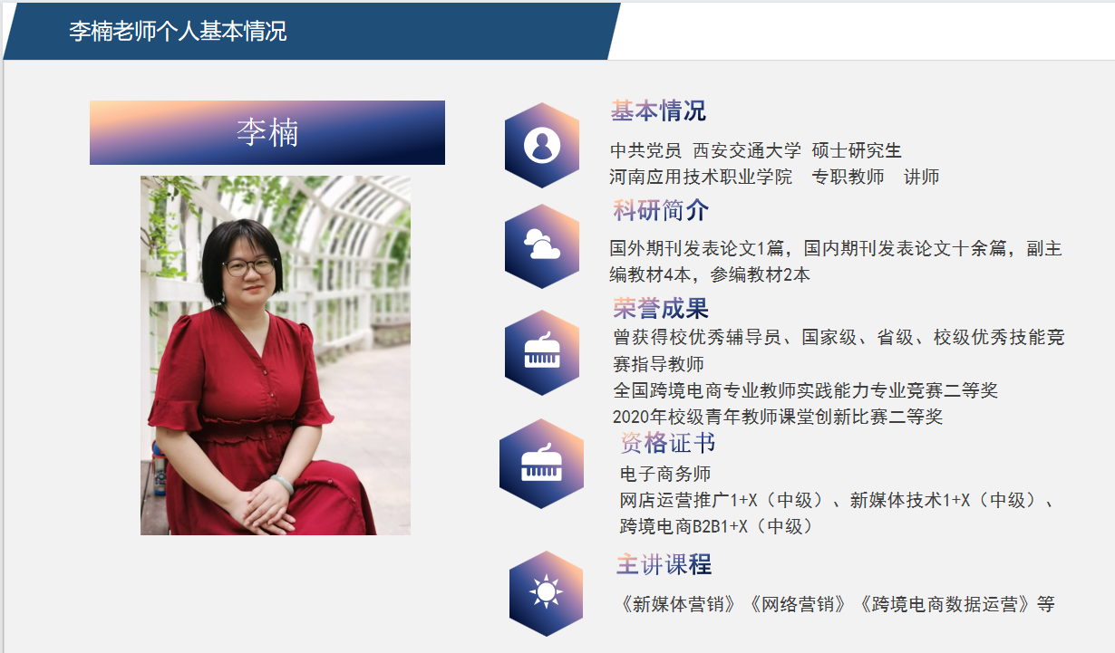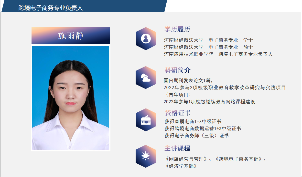 目前跨境电商专业教师是一支充满活力与创新精神的团队。与此同时,老师们也在不断的学习、培训,及时更新知识技能,以便向员工传授行业最新的知识、技能。