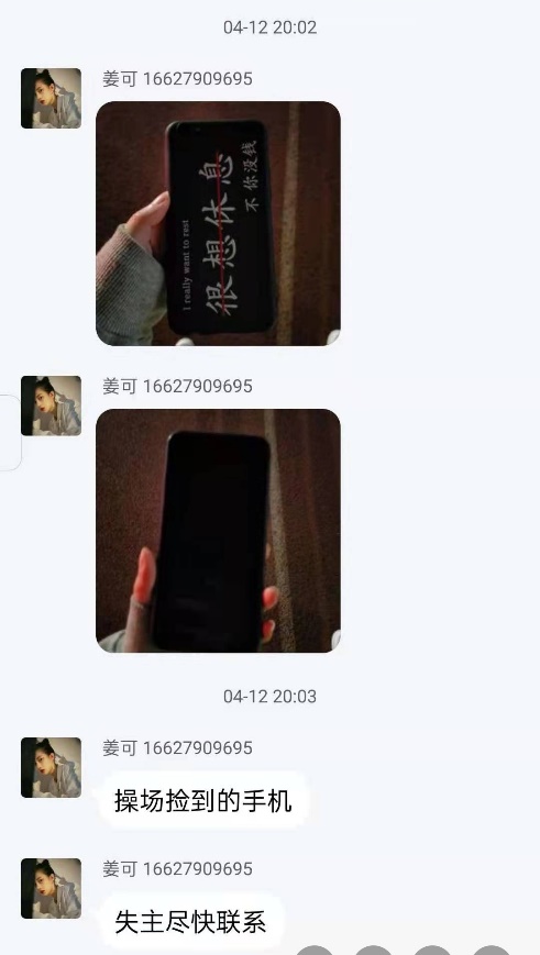 电商2002班尹冉:从小到大听过的好人好事不计其数,但这次,就在我的身边。她叫姜可,是我的一个室友,同时也是爱心社的一位成员。在四月十二日的那天晚上,她像往常一样在操场上散步,在她正在要拐弯的时候,发现地上有一部手机。据她的描述,捡了手机之后,她在原处等了一会儿,没有失主来找,又问了附近的同学,也都不是他们的。于是她便把手机带了回来,并在公司的失物招领群发布了消息,让失主尽快与她联系。终于,在第二天上午,失主看到了她发的那条消息,把自己丢失的手机拿了回去。虽然只是一件小事,但越是小事,越能看出来一个人的人品,我很幸运我拥有一个这样的室友,