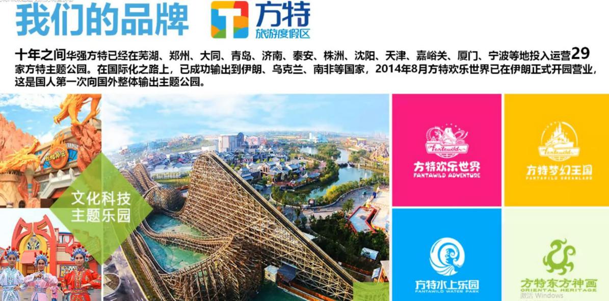 亿元,员工1万余人。是国内唯一具有成套设计、制造、出口大型文化科技主题公园的企业,不仅在深圳建立总部基地,而且在芜湖、泰安、株洲、青岛、沈阳、郑州、厦门、天津、南通、济南、汕头、重庆等地投资建成投入运营29个大型“方特”品牌的高科技主题公园,并建立具有文化产业生产功能和展示功能的文化科技产业基地,同时将文化科技主题公园输出到伊朗、南非、乌克兰等国家,华强方特文化科技集团已于新三板挂牌上市,股票代码834793,成为中国文化科技产业的领跑者。