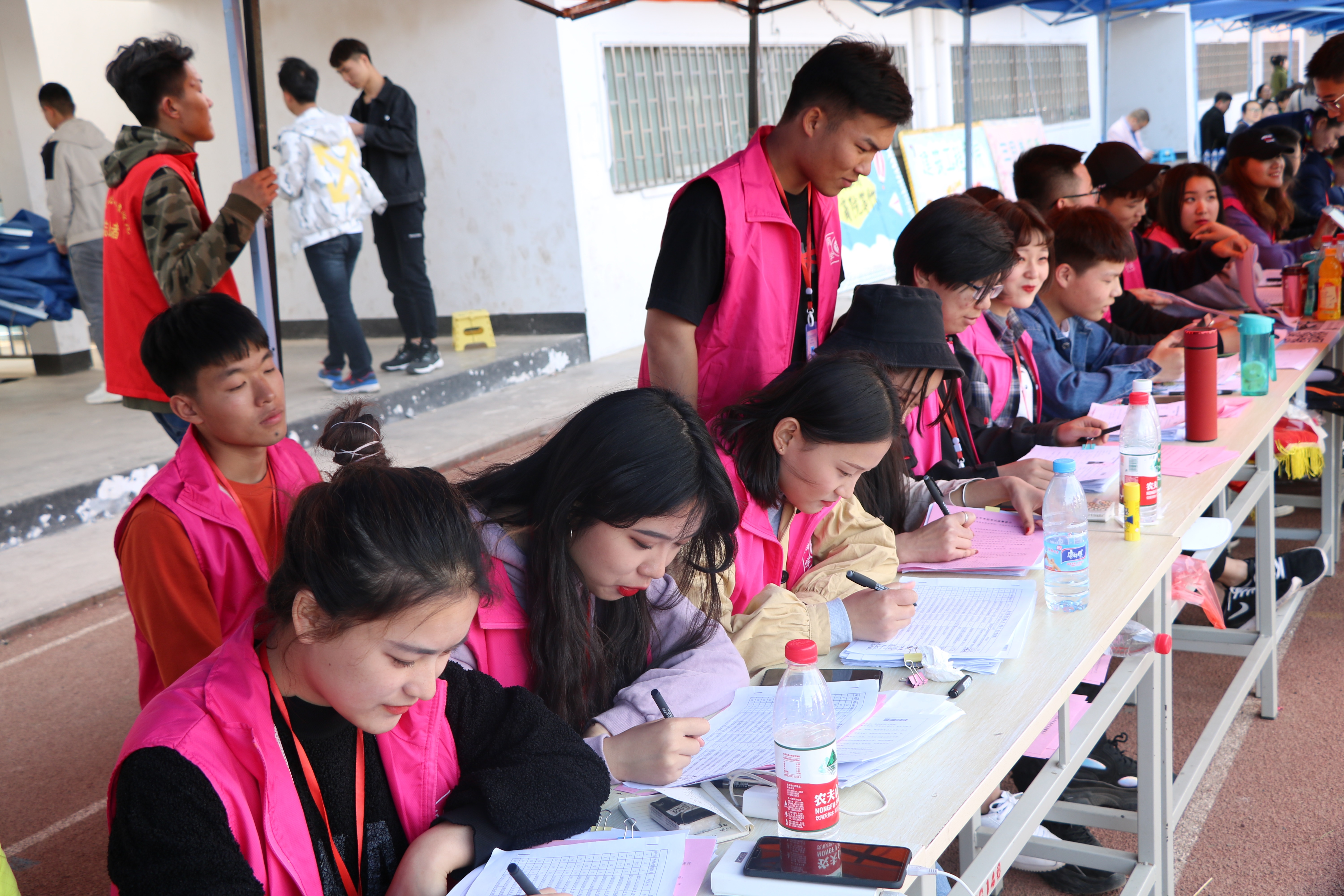 31日,单招考试开始,不管是早上指引考生按考场集合,还是中间转场考试,以及为候场考生分发午餐,每一位引导人员都快速、有序的完成了工作。考试完毕,考生如释重负,但是小粉们并没有离场,所有成员把卫生打扫干净,桌椅归位,做到了好的开始,好的结束。