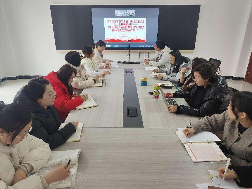 首先,宣传委员刘嘉慧领学了《习近平在二十届中央纪委三次全会上发表重要讲话强调:深入推进党的自我革命 坚决打赢反腐败斗争攻坚战持久战》。文章指出经过新时代十年坚持不懈的强力反腐,反腐败斗争取得压倒性胜利并全面巩固,但形势依然严峻复杂。教师要对反腐败斗争的新情况新动向要有清醒认识,对腐败问题产生的土壤和条件要有清醒认识,以永远在路上的坚韧和执着,精准发力、持续发力,坚决打赢反腐败斗争攻坚战持久战。