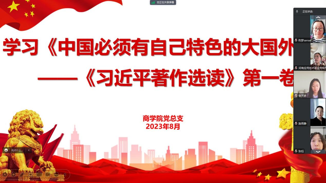 2023年8月9日下午,公司党总支组织全体教师进行政治理论学习,主要集中学习《习近平著作选读》(第一卷)中的《坚持以人民为中心的创作导向》、《中国必须有自己的特色外交》等重要内容。本次学习以线上的方式进行,由公司党总支书记苏云峰主持,3044永利集团全体教师参会。