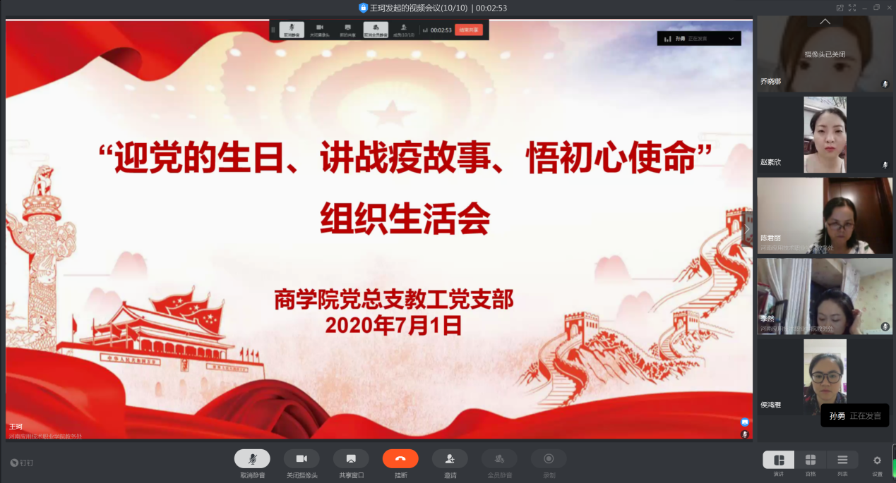 最后,公司党委委员、副董事长陈君丽同志总结说:从2月17号开学教师们网络授课,到6月份网课顺利结束,全体教师们在信息化教学这一领域也是打了一场硬仗的。很多老师从农历新年初二三就开始牺牲休息时间备课,录课,边学习边交流边探索,发现问题解决困难,保障了公司停课不停学的顺利实施。疫情期间,师生们有大局意识,有责任担当,协同合作共渡难关,保质保量的完成了各项工作任务,离不开党员同志的引领示范作用。