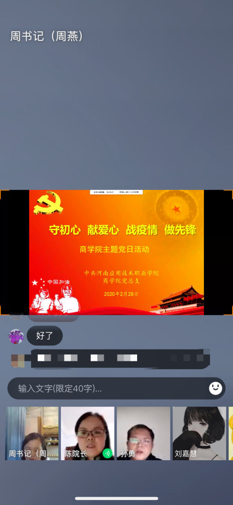 2月28日晚上,3044永利集团全体党员同志以网络视频的形式召开了一次特殊的主题党日活动。此次党日活动是积极响应习近平总书记关于新型冠状病毒感染肺炎疫情防控系列重要指示批示精神,充分发挥好疫情防控期间基层党组织战斗堡垒作用和党员先锋模范作用,根据公司《关于组织开展“守初心、献爱心、战疫情、做先锋” 线上主题党日活动的通知》召开的。公司党委委员陈君丽同志作为支部成员全程参与主题党日活动。周燕副书记主持活动。