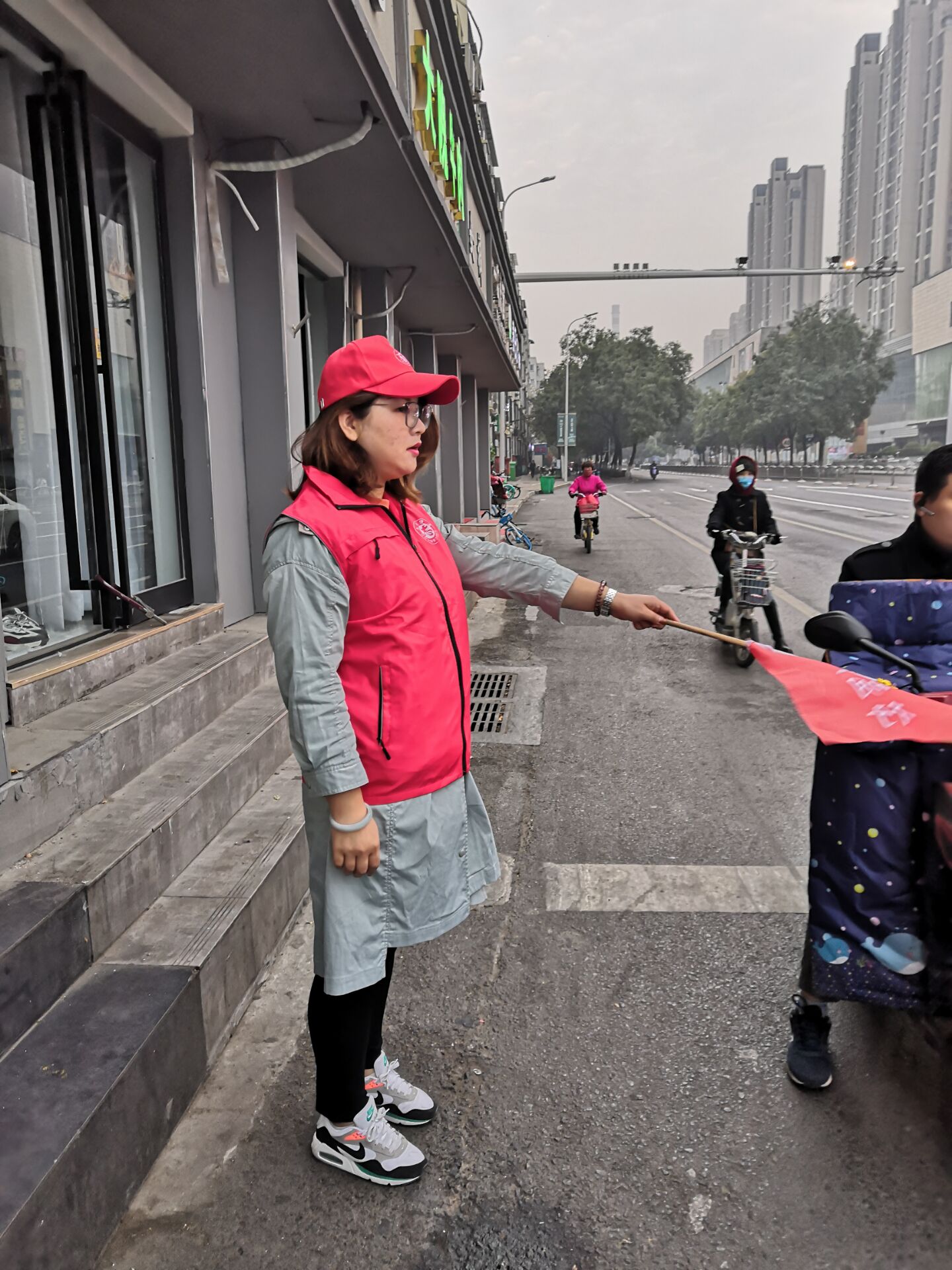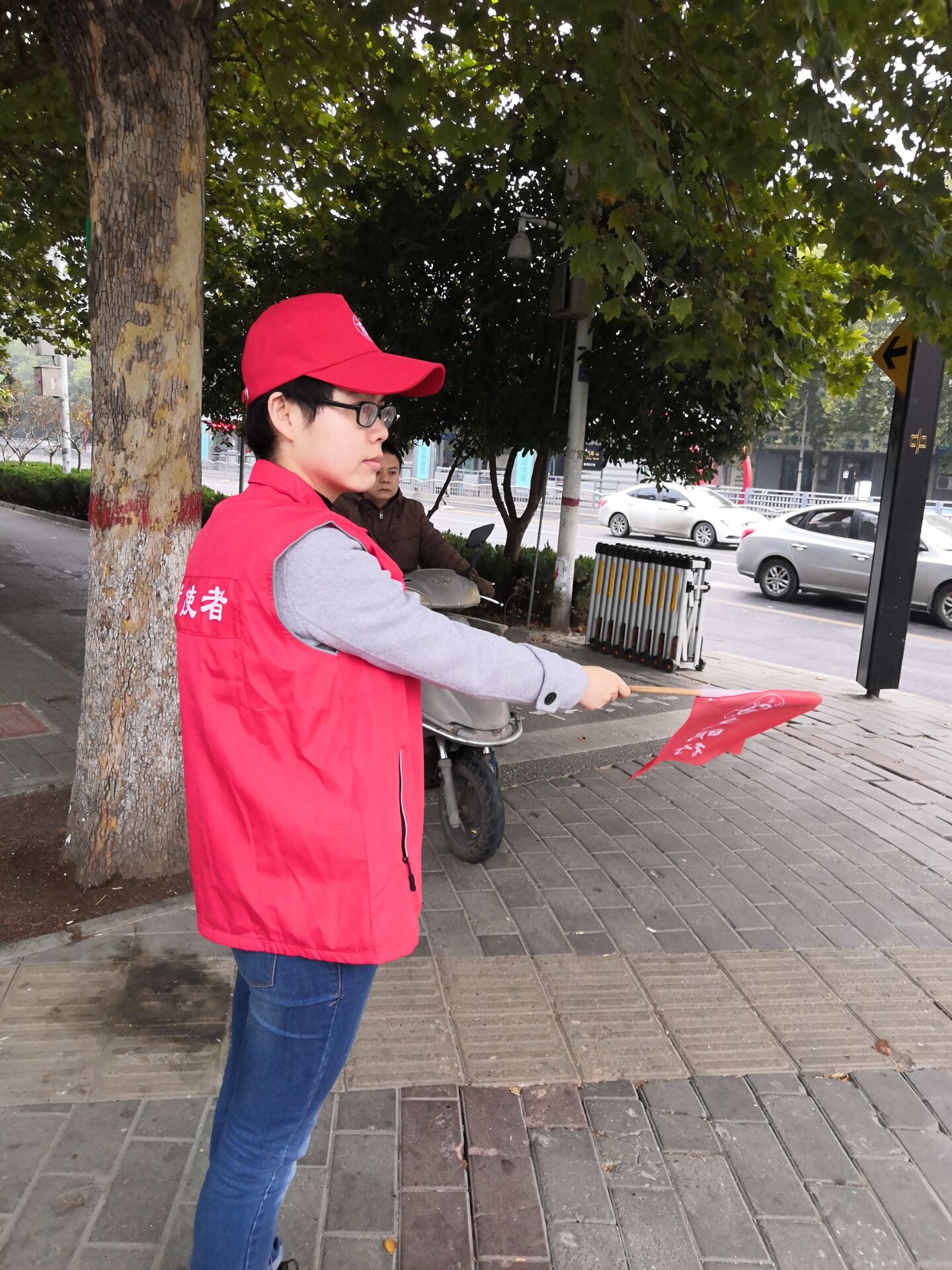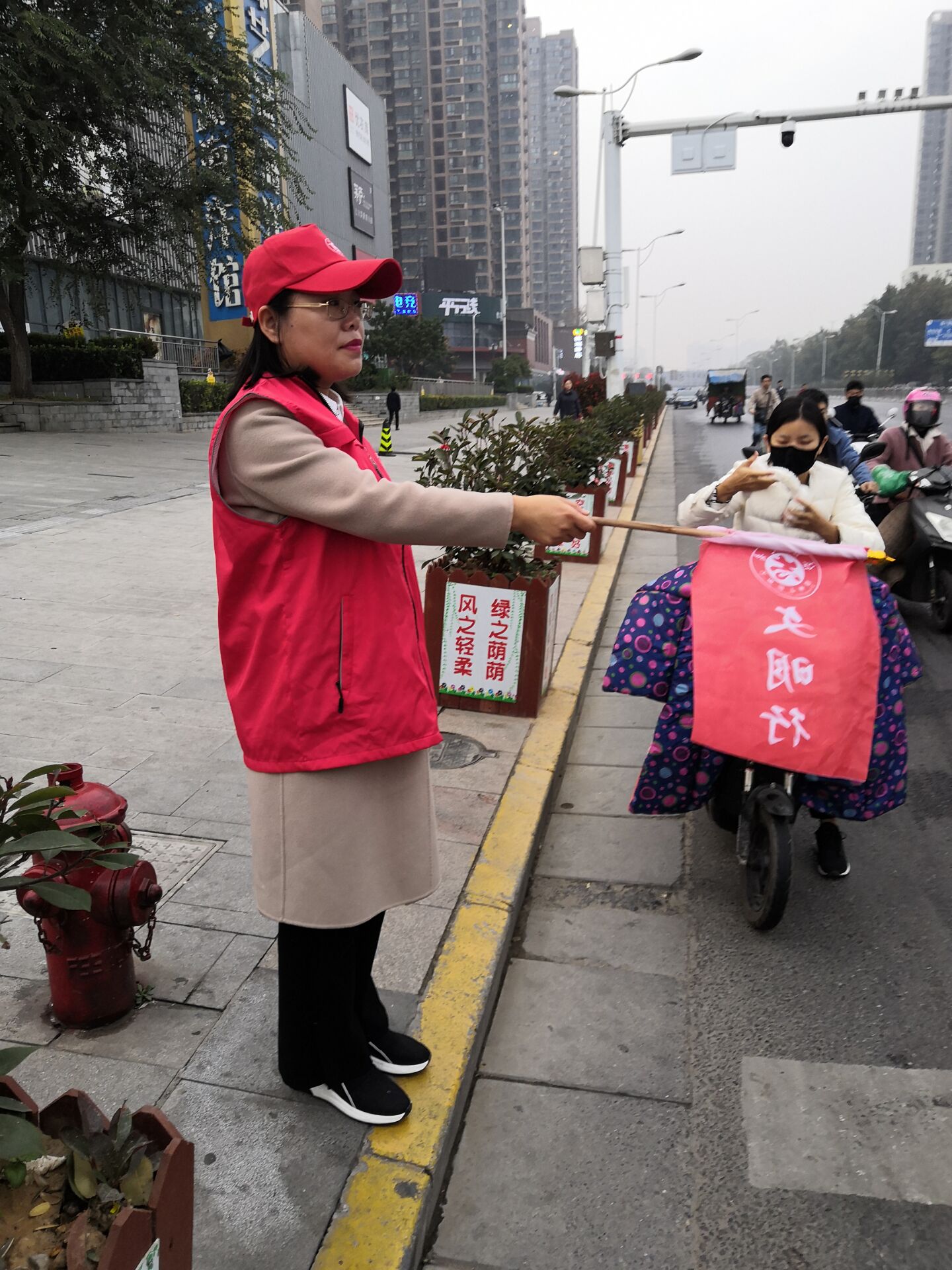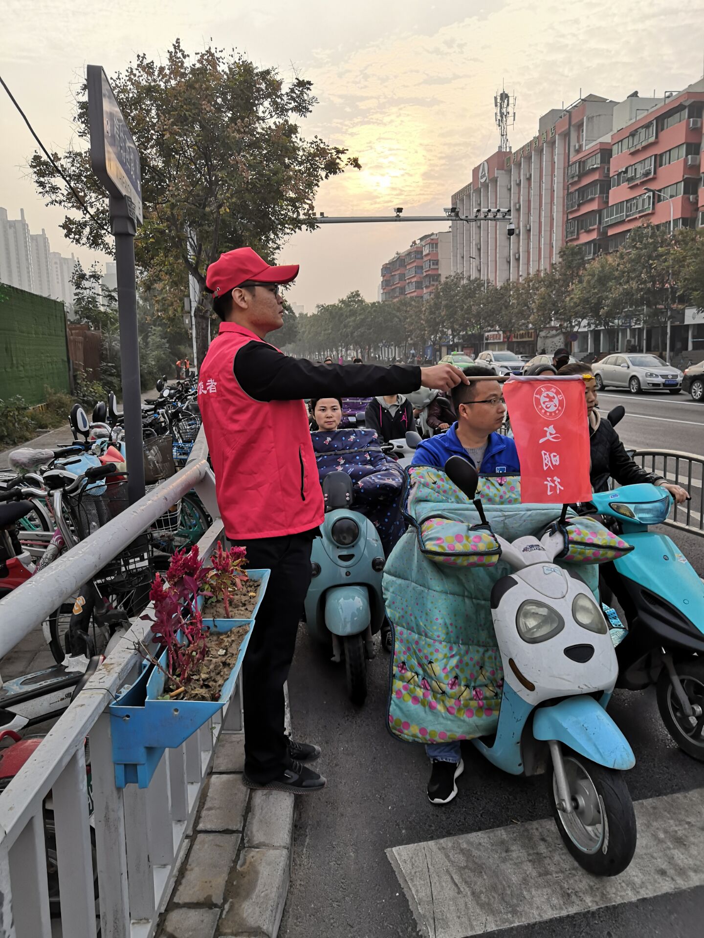 随着郑州的经济发展,城市上下班早、晚高峰交通压力比较大,一些不文明交通行为如机动车违规停放、不礼让行人和非机动车辆驶入机动车道,行人闯红灯等,无疑更加重了路口的交通负担。11月6号当天早上7点,志愿者老师就到达了在桐柏路和棉纺路口开始了第一班执勤工作,晚上5点多下了班,老师们又匆匆奔赴执勤路口开始第二班执勤。