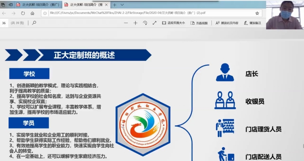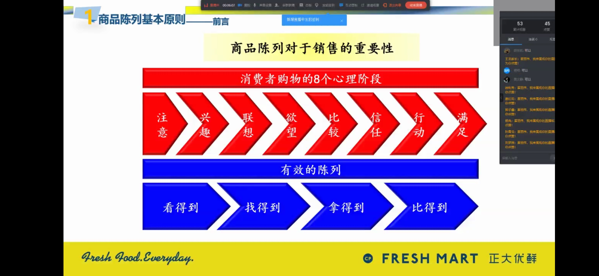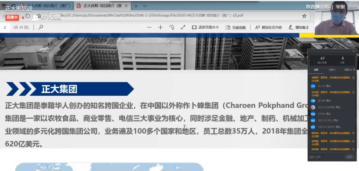 2020年4月28日-4月29日为期两天的“正大订单班”理论培训在线上开展,正大集团特派电商主管翟丽伟老师来进行培训,主要对正大集团企业文化、员工行为规范、电商订单处理流程、门店商品管理流程、商品陈列等方面进行详细讲解,正大班员工对企业培训表现出极大的兴趣,培训过程中积极参与,反响强烈。
