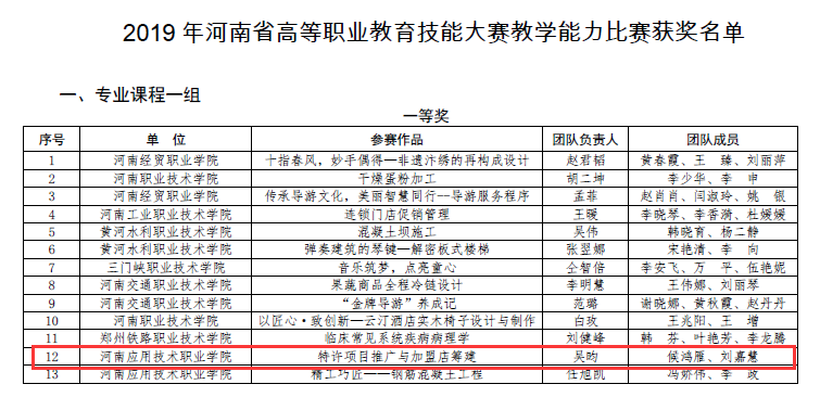 近期,在刚刚结束的2019河南省职业院校教学能力比赛上,公司教师吴昀、侯鸿雁、刘嘉慧三位老师一路披荆斩棘,经过初赛的作品录制、资料准备和复赛的现场说课、讲课、答辩等众多环节后,最终的《特许项目推广与加盟店筹建》作品荣获省级教学能力比赛(专业课一组)一等奖的佳绩。