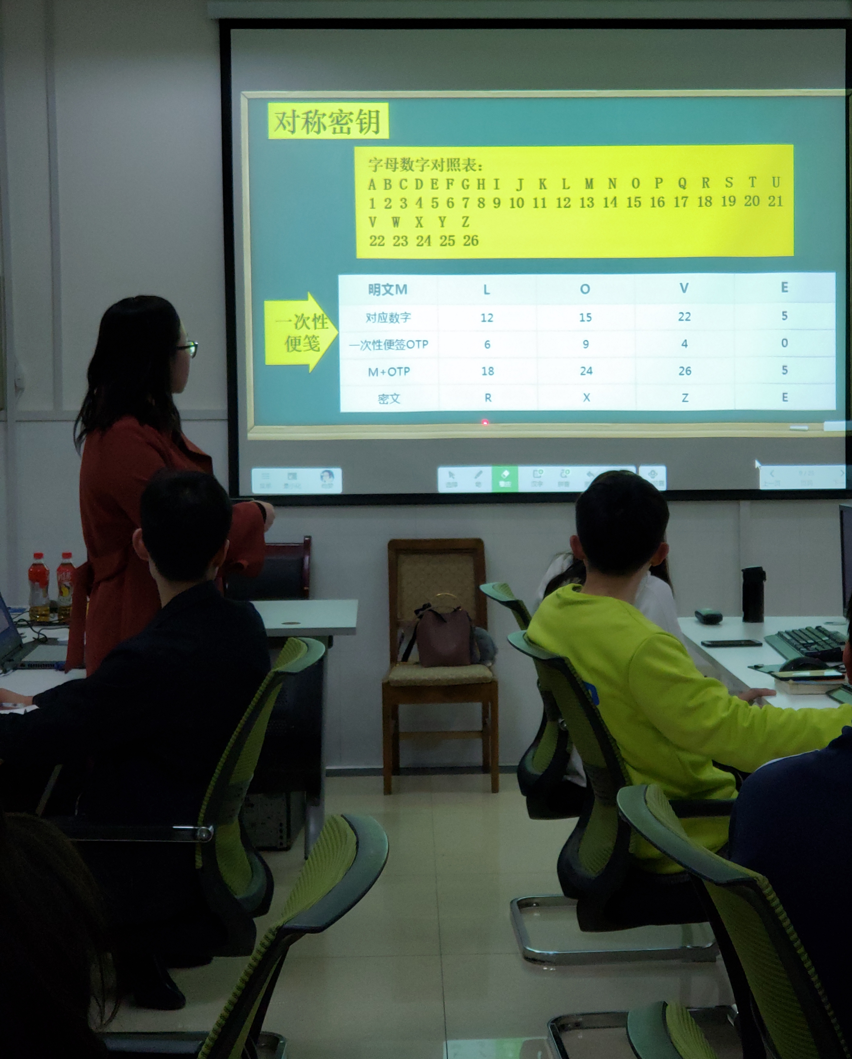 上课期间,吴老师以一个魔术表演,成功抓住了老师和同学们的好奇心,吴老师在最后的魔术解密中说:“几乎每一个魔术师都有托……,我和我的托之间的交流就是运用了加密,是最简单的语言加密技术”,由此引出本节课的主题,——“加密技术”。