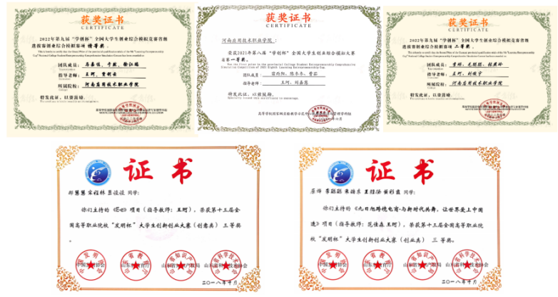 2021年、2022年“学创杯”全国老员工创业综合模拟竞赛,省级选拔赛创业综合模拟赛项获:特等奖、一等奖和二等奖。