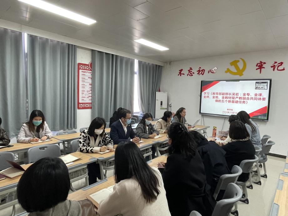 会议集中学习了《教育部副部长吴岩:金专、金课、金师、金地、金教材是产教融合共同体要做的五个新基建任务》、《高等公司实验室消防安全管理规范》等文件。