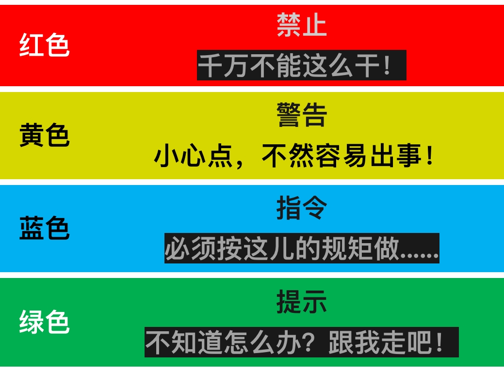 传递安全信息含义的颜色,包括红、蓝、黄、绿四种颜色,各类颜色可以简单解读为: