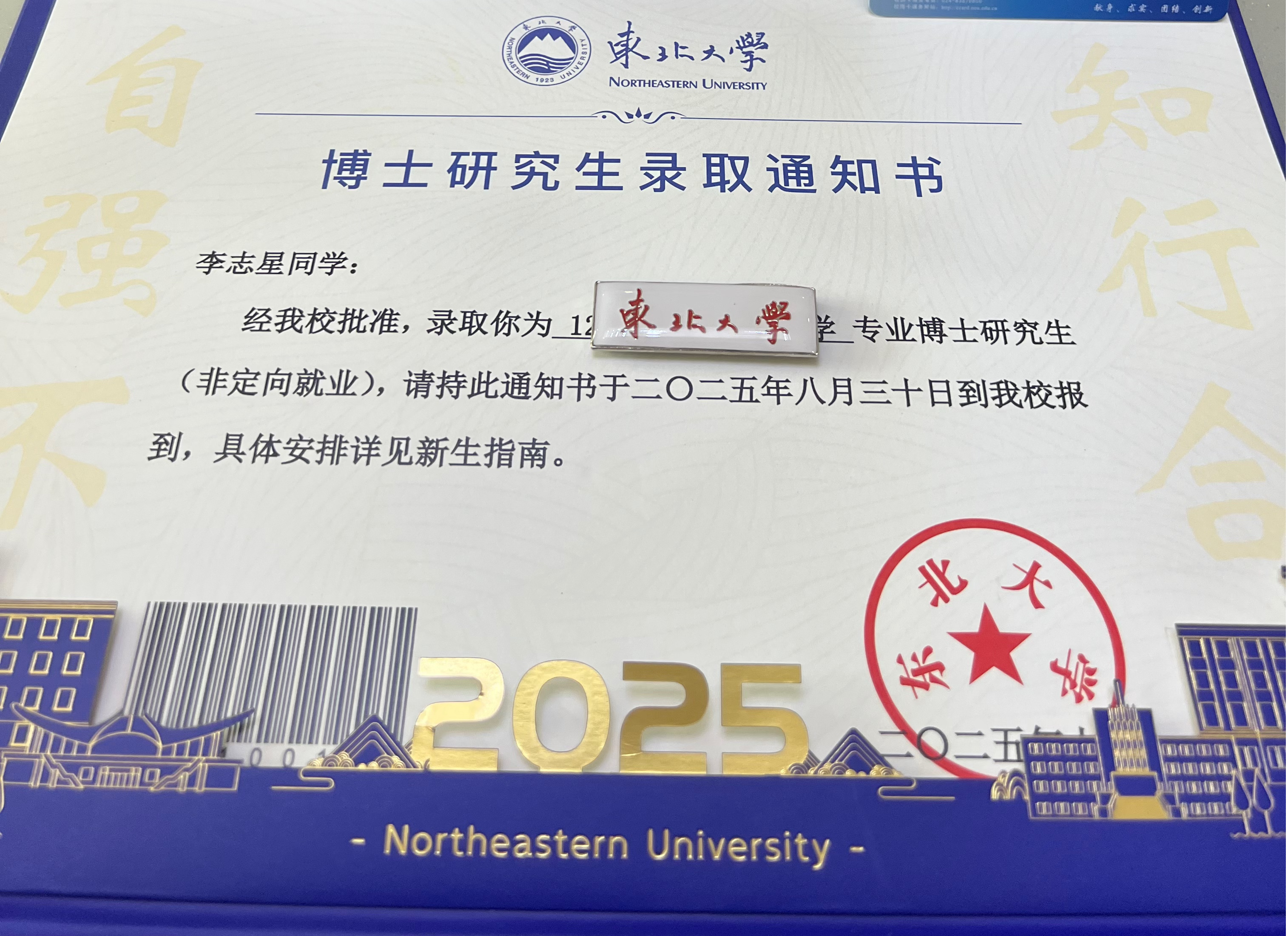 2025年7月17日,3044永利集团物流1702班毕业生李志星收到东北大学博士研究生录取通知书,以十二年持续奋进的求学经历,在高等教育的进阶之路上留下了坚实足迹。