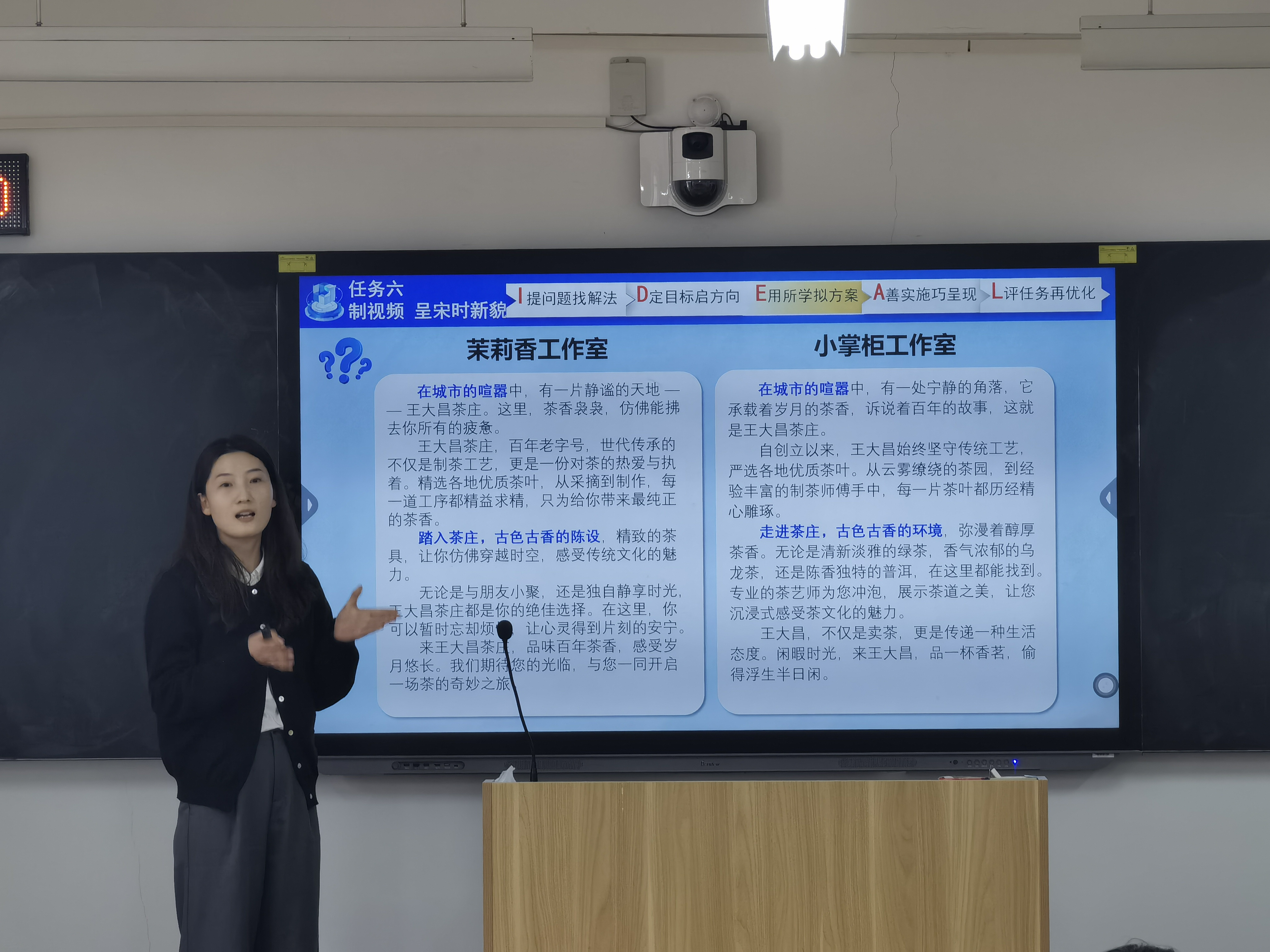 王璐选择《网络营销》课程中的《选题与内容设计》模块进行教学展示。课程以王大昌茶庄“梅香雪”“清香雪”系列产品推广为实践项目,通过“拆解-模仿-创作”三步法,探索传统茶文化在短视频时代的年轻化传播路径,展现了产教融合背景下教学创新的生动实践。