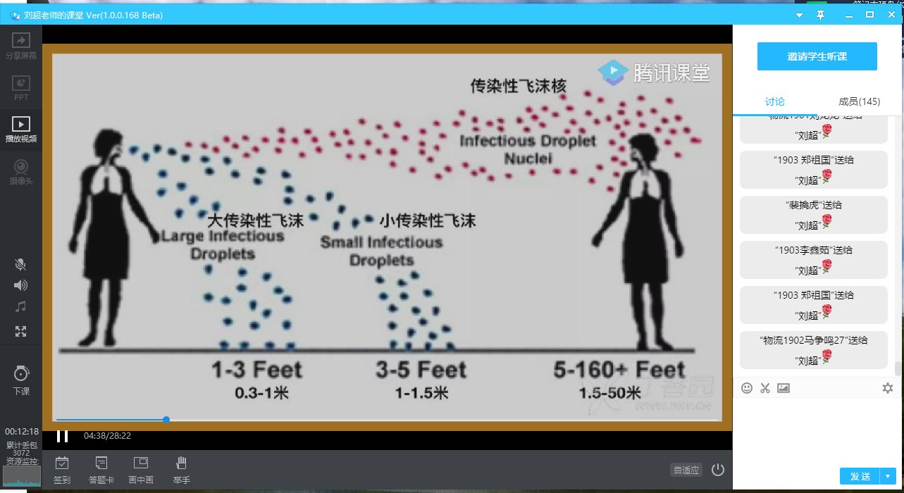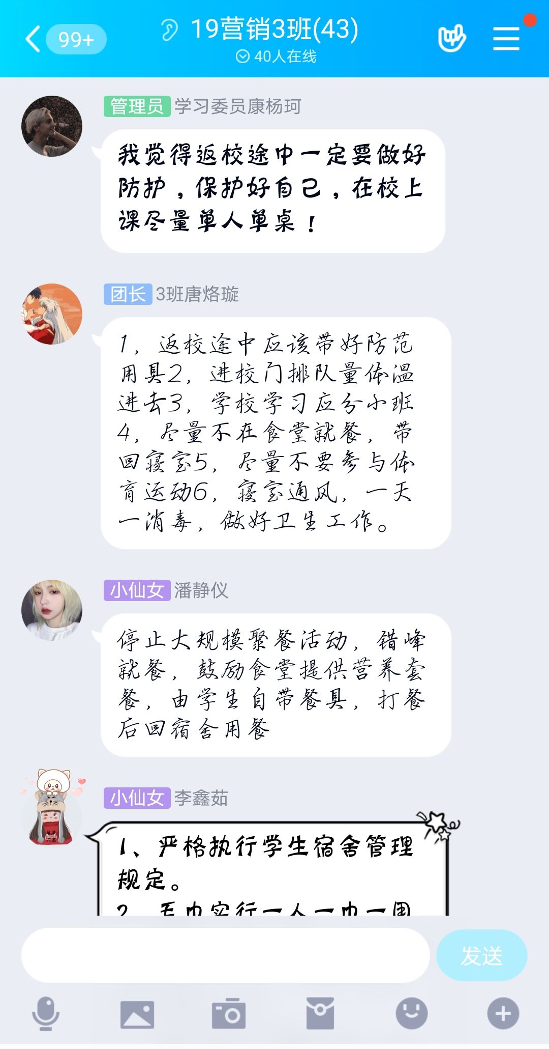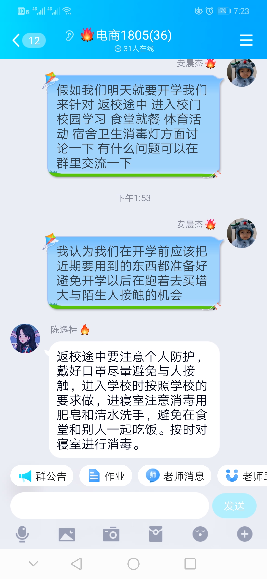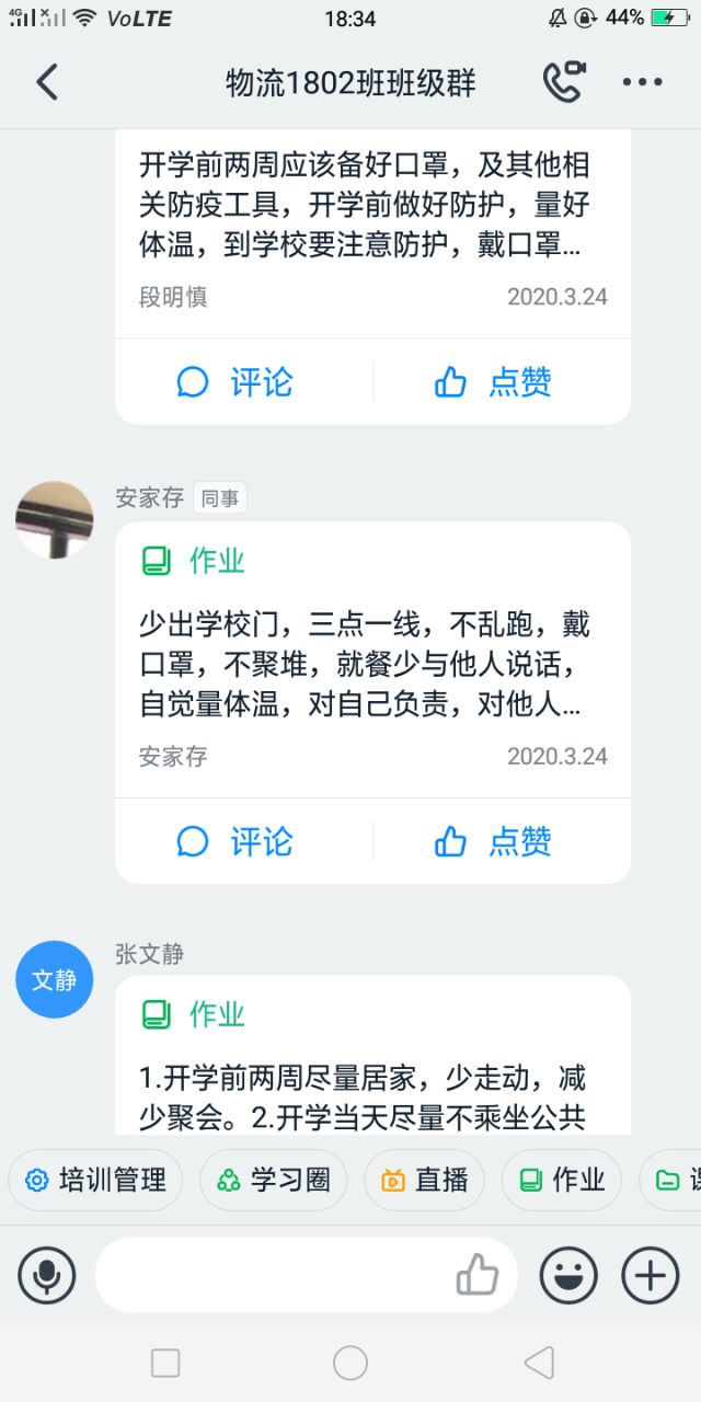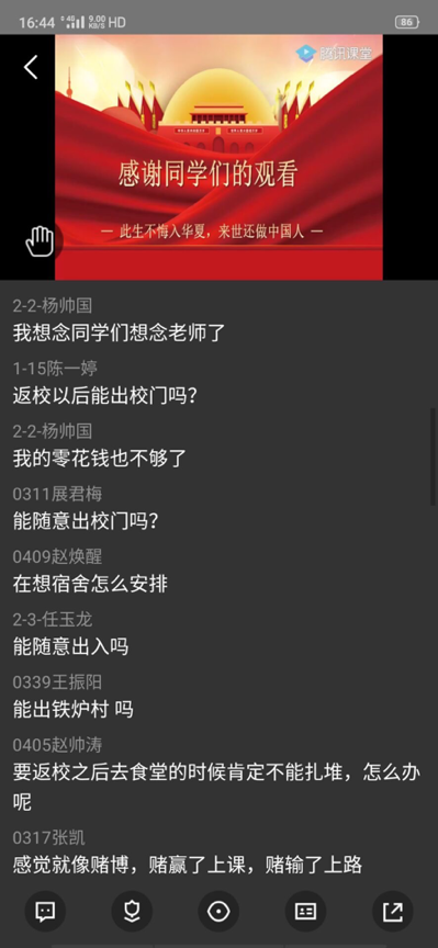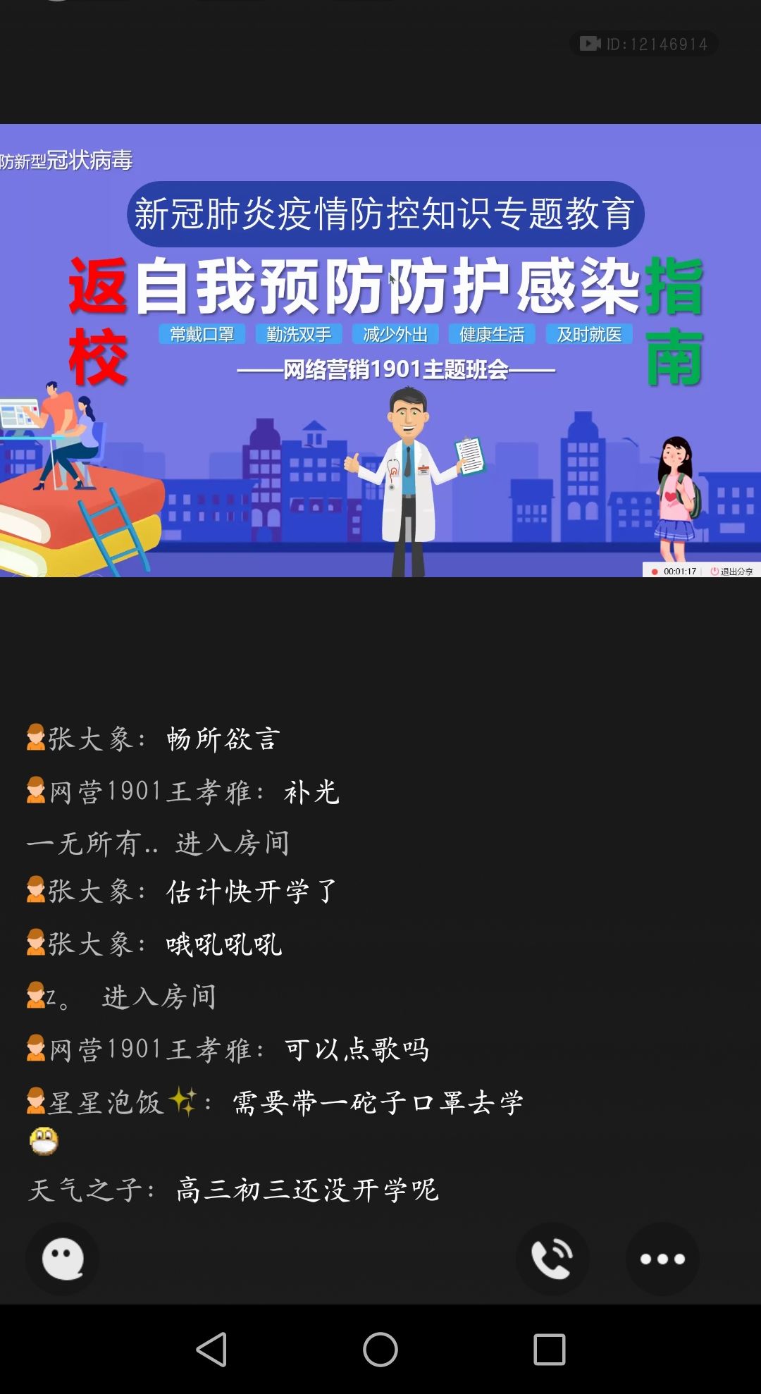 辅导员老师利用钉钉、腾讯课堂、QQ等网络工具组织员工观看了“疫情防控科普知识” 讲座视频和科普小视频,同学们针对返校途中、进入校门、校园学习、食堂就餐,体育活动、宿 舍卫生消毒等方面如何做好防疫工作进行了热烈的讨论。