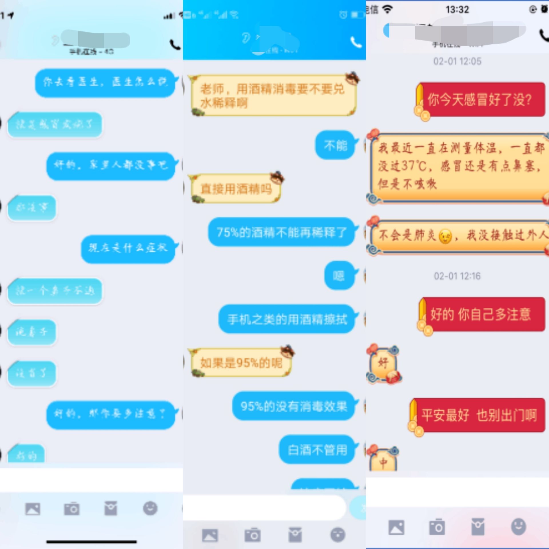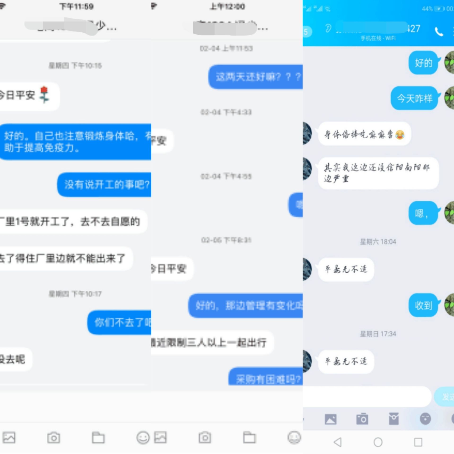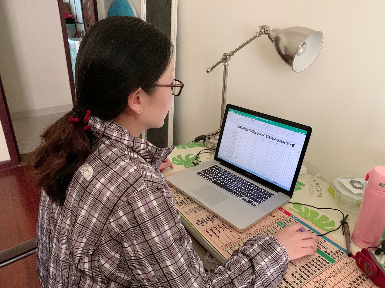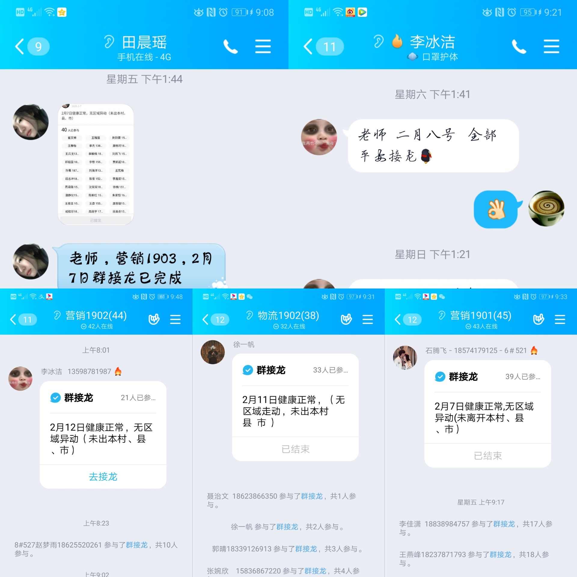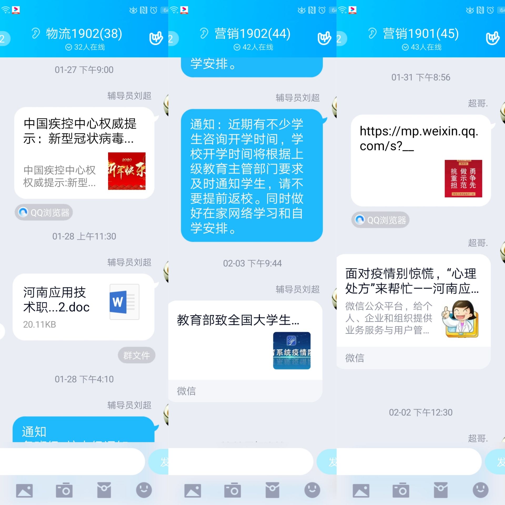 深处重灾区的李力老师对疫情感知敏感,当公司的通知还未下达的时候,班委同学们已经接到了老师安排的疫情排查工作任务;李红老师逐一向家长打电话确定员工的去处,确认班级同学都平安返回家中;面对不能及时回复信息的员工,刘嘉慧老师和李琼老师一遍遍的发信息、打电话,直到确定每个员工都安然无恙;侯鸿雁老师积极搜索防护知识,在统计数据时,针对在外打寒假工的或者在亲戚家的员工增添了“紧急联系人”一项;董会、李莎、刘超等老师每日在员工群内发起接龙,确保员工的平安;席文玲、吴昀、李冲、吴朝阳等老师认真回复员工的疑问,引导员工科学理性看待疫情,不造谣、不信谣、不传谣;面对17级顶岗实习员工,乔光辉、王传琪、周莉娜、王莉4位老师毫不懈怠,第一时间对遍布全国的员工开展通知发布、防控排查、关心慰问等工作,及时掌握员工动态信息。