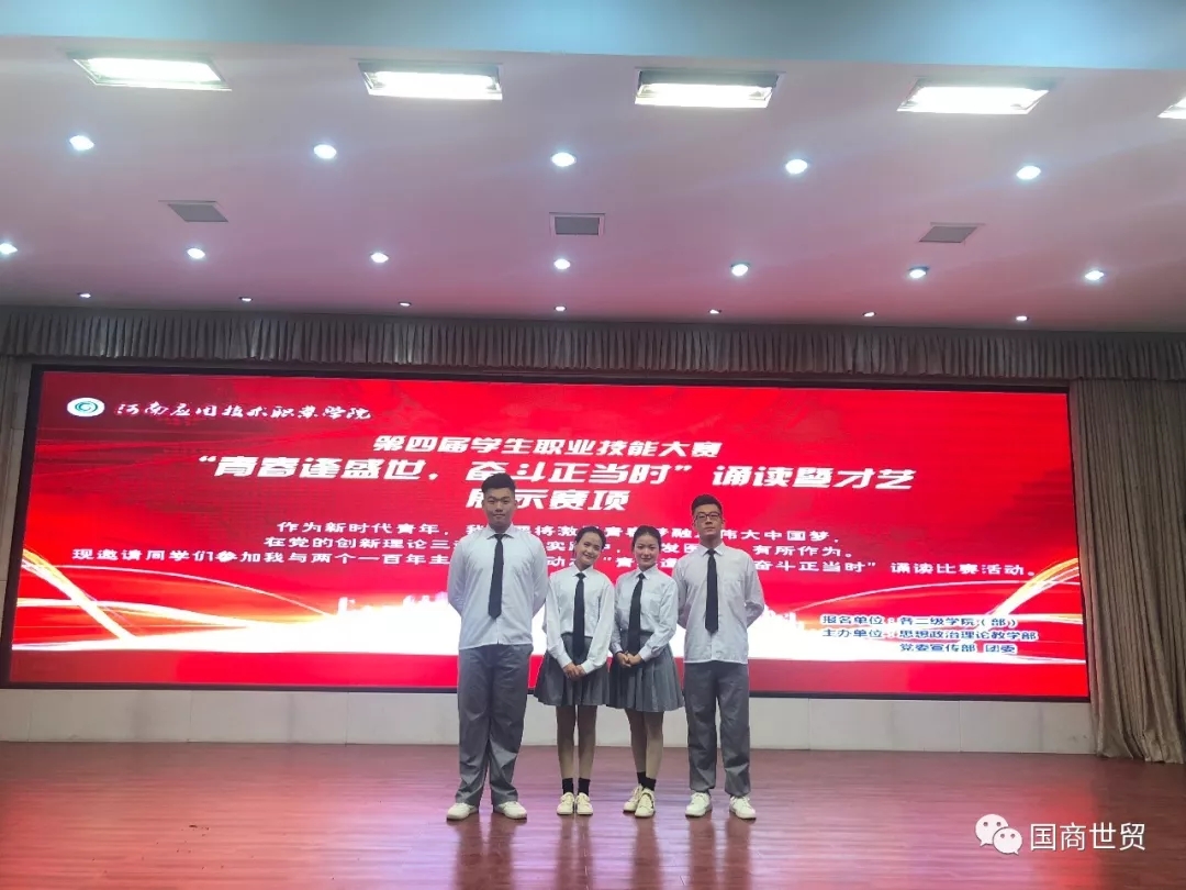 本次朗读比赛在校实训楼二楼会议室举行,共有来自各公司12各代表队参加,赛场上各参赛队激情澎湃,斗志昂扬,整场比赛充满青春的张扬与活力。商贸公司的四名参赛选手分别是:朱攀、黄可洁、朱若愚和李中华,他们顶住压力,以沉稳之风用自己的青春梦、大学梦和中国梦在赛场上展示了一场精彩缤纷的朗诵。从11月中旬准备至今,选手们付出很多,只为上台朗诵的这一刻发出自己对祖国繁盛的激情与感慨,只为表达出自己对青春,对未来,对梦想的执着。而比赛结果是对他们付出的认可和激励,二等奖第六名的比赛成绩,让他们又有了新的追求,下一次更好,更棒。就像他们在朗诵时激动的感慨着:我们将带着智慧和汗水向着我们的大学梦继续前行向着我们的中国梦继续前行!我们每一个人都将继续朝着自己的中国梦砥砺前行,用我们的梦想共同筑建起伟大的中国梦。
