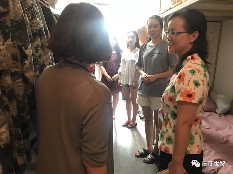 陈君丽经理一行看望了女生宿舍楼7号楼、8号楼的所有公司新生们,从一楼到七楼,陈经理亲切的与同学们进行交谈,询问同学们入住是否适应,饮食是否习惯,查看了宿舍的入住情况,并叮嘱同学们要警惕外来传销人员,切勿轻信扫二维码的小广告等。