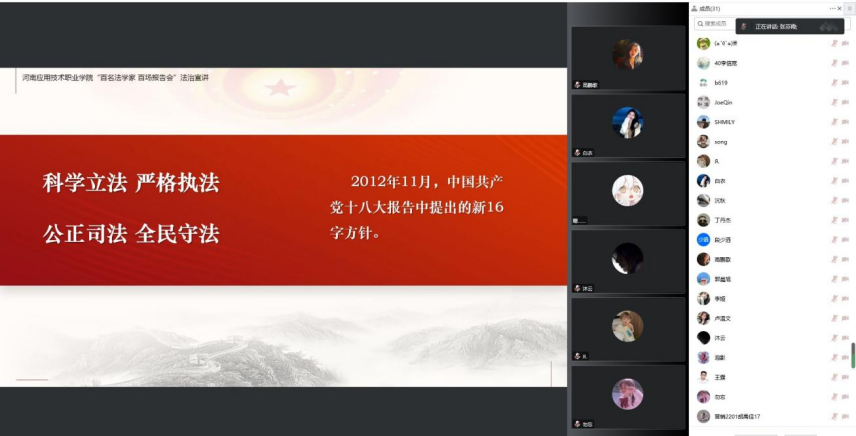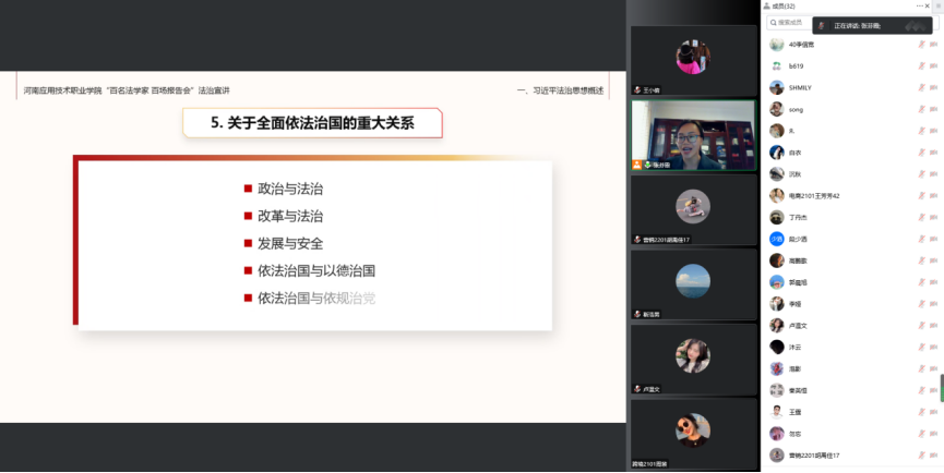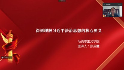 张芬霞老师主要从习近平法治思想概述、坚持以人民为中心的根本立场、坚持党对全面依法治国的领导、坚持中国特色社会主义法治道路以及法治思想重要环节五个方面进行理论宣讲,本次法治宣讲张老师深入浅出的对习近平法治思想的核心要义进行解读,让员工更深入的了解在中国共产党的领导下,我国社会主义法治建设取得的重大成就,以及对社会主义法治建设彰显的以人民为中心的发展思想有了更加深刻的认知。讲座结束后,张芬霞老师线上与员工进行了亲切互动,活跃了课堂气氛,提升员工的获得感,针对员工提出的一些法治思想问题,张芬霞老师也进行认真分析和耐心解答。