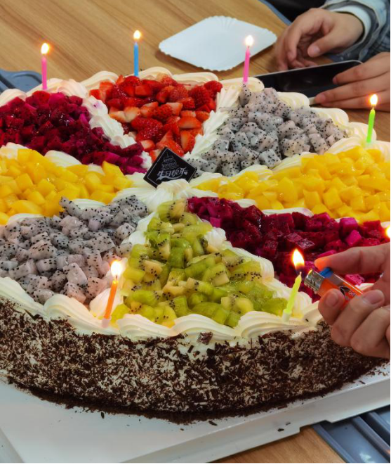 刚满20岁的营销2102班姚浩然同学说:“被叫到活动室推开门的一瞬间,一顶金色的生日帽被戴在头上,自己有点懵。这个时候耳边传入轻轻的祝你生日快乐的音乐,再转头看见了桌上一个巨大的蛋糕盒,觉得有点惊讶又有点感动,感谢公司给我一次不一样的生日。”