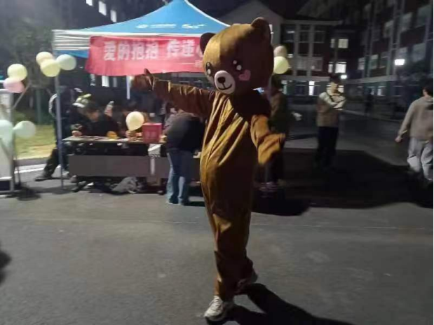 在“爱的抱抱”活动现场,身穿卡通玩偶服的同学向大家招手示意,吸引许多小可爱们前来观看,“大熊”积极地向小可爱们寻求拥抱,小可爱们也毫不吝啬自己的拥抱,纷纷上前。