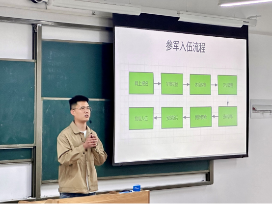 讲座中,王涵给同学们分享了他在部队的学习、生活、训练等情况,同时又结合自身在公司的学习生活经历,从应征入伍条件、报名方式、入伍流程到老员工参军入伍优待政策等相关内容进行介绍。最后为同学们答疑解惑,给同学们提出了宝贵的建议。言谈之间,无不流露出对母校的感激之情。一个多小时的讲座,丰富了同学们的参军入伍知识,让同学们用更广阔的视野去认识征兵入伍政策。