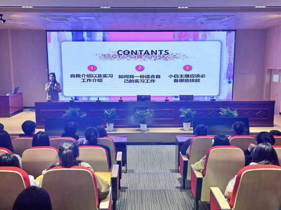 经验分享会伊始,刘馨怡以幽默风趣的方式拉近了与学弟学妹们的距离。接下来她从实习工作介绍、如何找一份适合自己的实习工作及小白主播应该必备哪些技能等方面展开分享。首先,她介绍了自己丰富的校园学习经历和实习经验。其次,在如何寻找实习工作方面,她提醒学弟学妹们要放平心态,并通过正规渠道来寻找适合自己的岗位,要充分认识到实习工作的重要性。最后,她向学弟学妹们表示小白主播要在这个竞争激烈的行业中脱颖而出需要不断提升自己的技能和能力,不断学习和创新。同时,也需要保持积极的心态和耐心,持续努力追求自己的梦想。