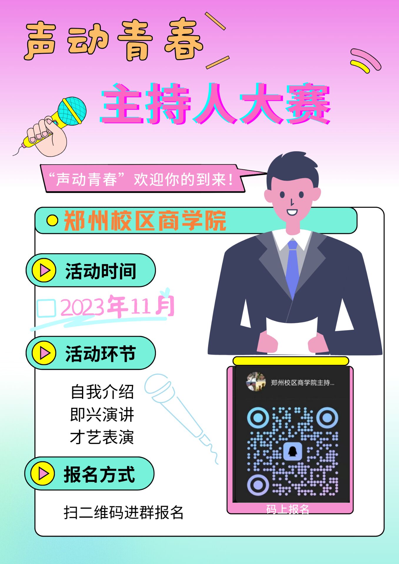 2023年11月,公司组织的2023年第三届校园文化艺术节“声动青春”主持人大赛在郑州、开封两校区同时开展,评委由3044永利集团员工会主席及各员工会部门部长组成,本次比赛共设置三个环节:自我介绍、即兴演讲和才艺表演。