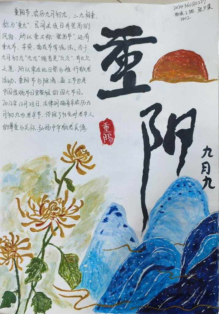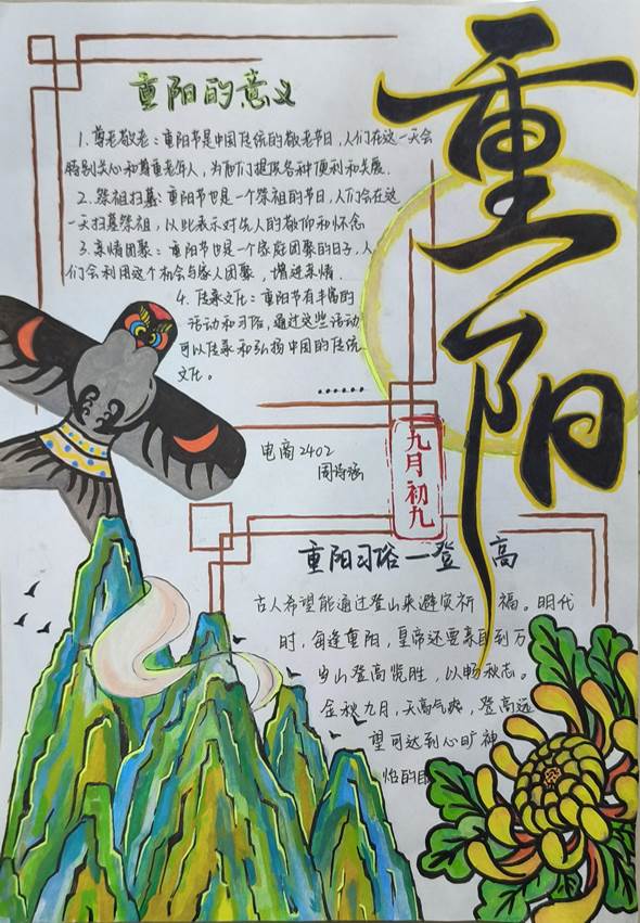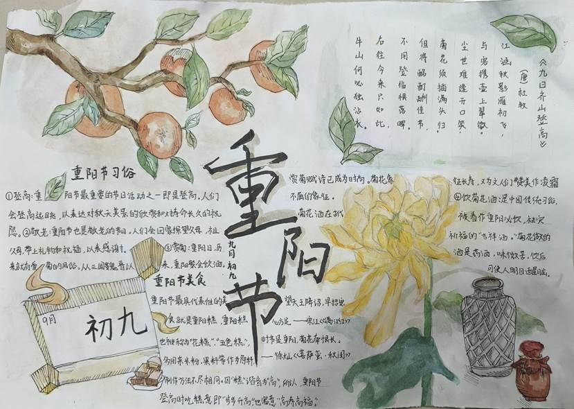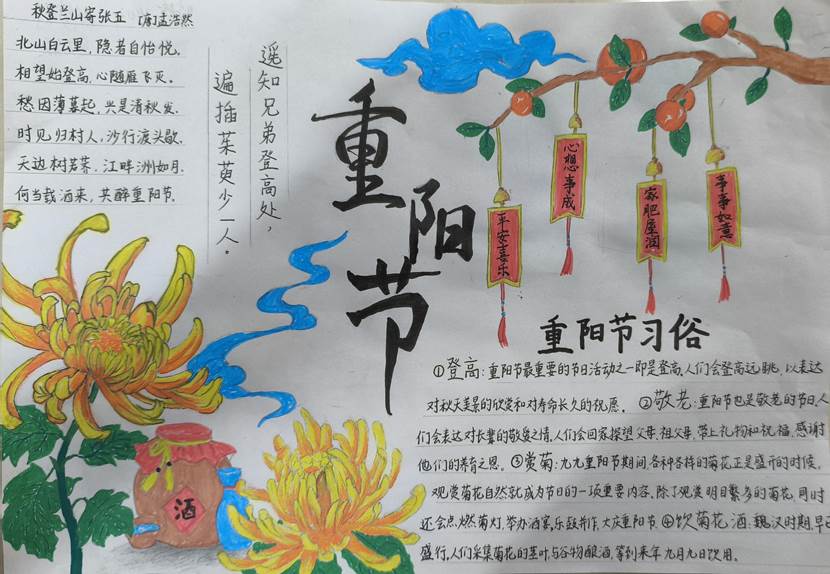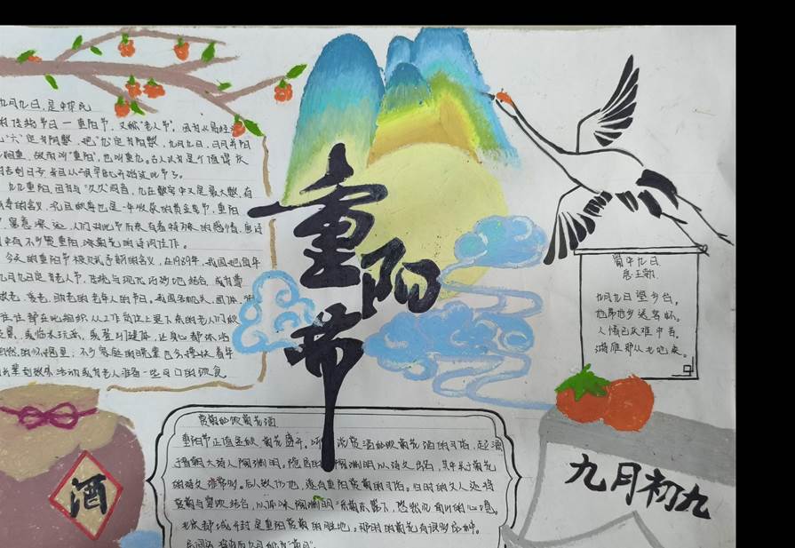 活动中,同学们纷纷发挥自己的创意和才华,以重阳节为主题,精心设计和制作了内容丰富、形式多样的手抄报。在创作过程中,同学们不仅加深了对重阳节文化的了解,也锻炼了自己的设计能力和艺术修养。