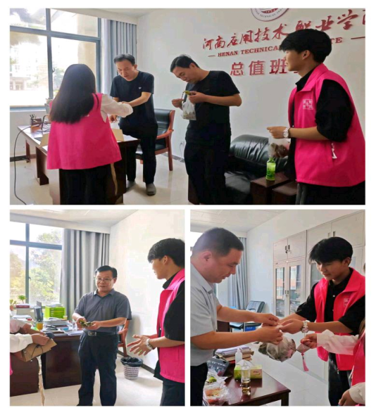 同学们将包好的粽子和制作好的香囊送给端午节当天值班的老师和在校的同学们,向他们表达节日的祝福。通过这种方式让他们感受到节日的氛围,同时感受到中华优秀传统文化的魅力。
