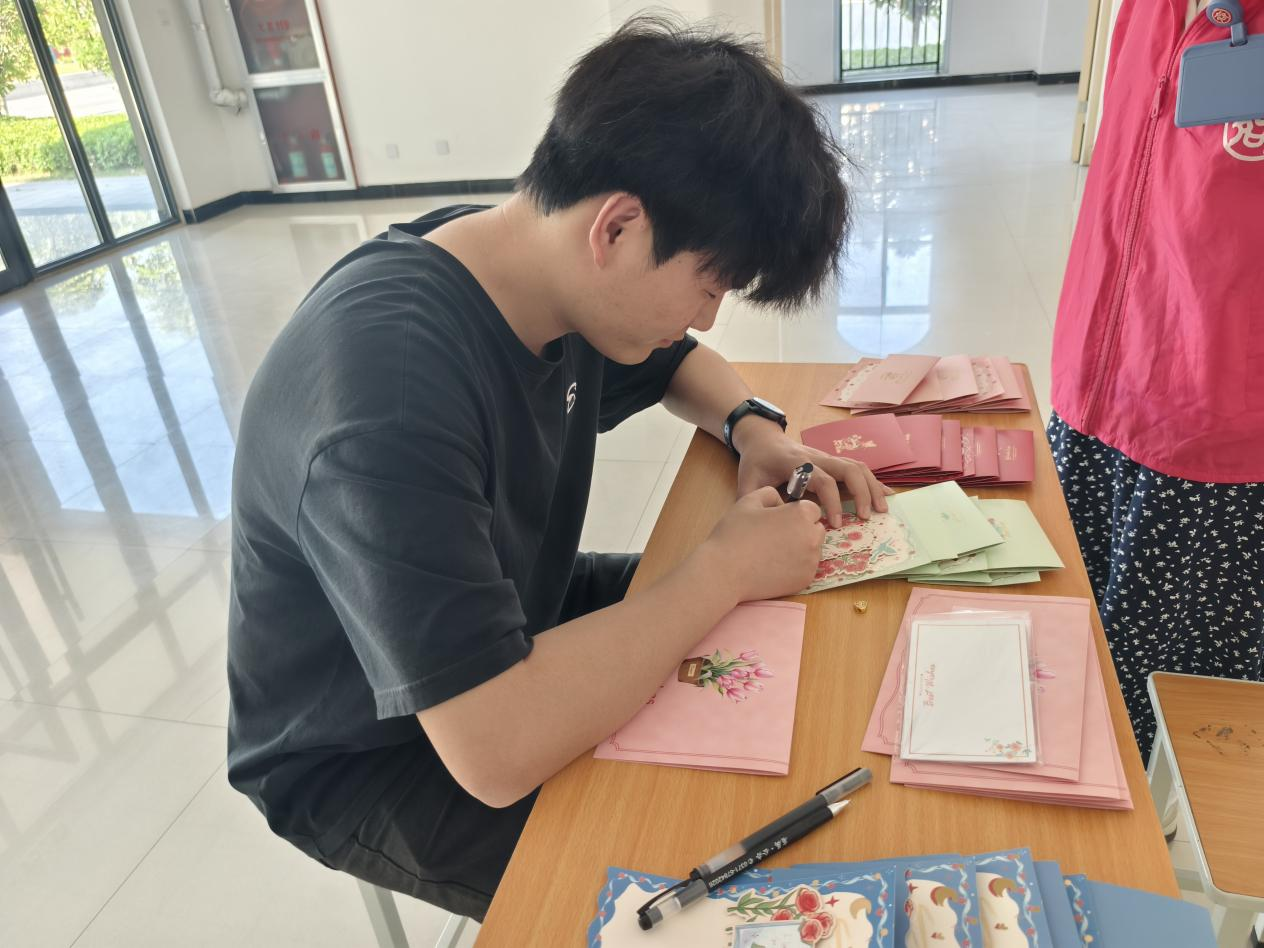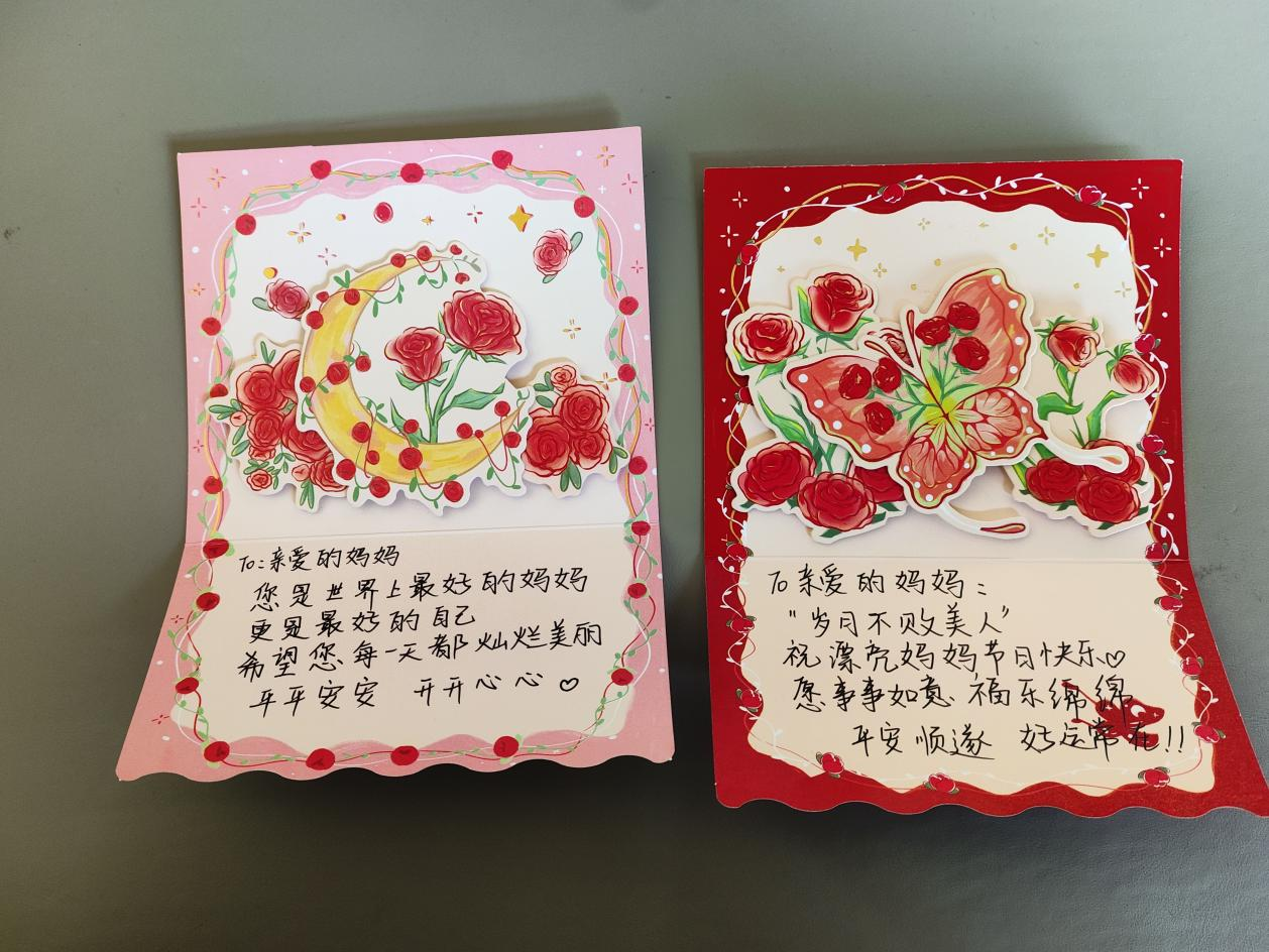 展板上陈列的贺卡,以笔为媒介,这些蕴含着深情的贺卡或质朴或精致,却同样炽热。当微风轻抚展板,贺卡的边缘轻轻翻动,宛如无数未言之语“妈妈,我爱您”在低语共鸣。这些凝固于纸张的柔情,终将转化为生活中具体的拥抱与问候,让感恩之情从展板上的文字,演变为日常生活中流淌的温馨。