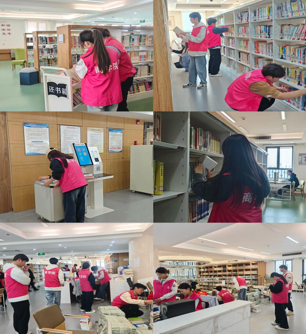 志愿者们用实际行动践行着志愿服务精神。他们的笑容灿烂又诚恳,构建出一道亮丽的青春风景线。经过志愿者们的辛勤付出,原本杂乱的图书,井然有序地陈列在书架上。整齐摆放的书籍不仅使图书馆环境更加整洁,还为借阅者提供了更加便捷的借阅服务。