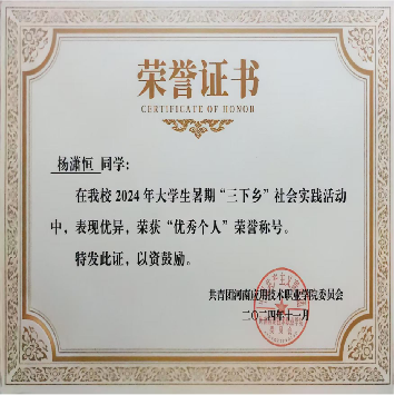 杨潇恒始终秉持“知行合一,服务社会”的信念,在刻苦钻研专业知识的同时,积极投身于各类社会实践与志愿服务活动中,努力实现自我价值的升华。他积极参与福利院志愿服务,用实际行动传递温暖。在活动前,他会提前了解相关内容。在到达福利院后,给孩子们讲故事,带领他们做简单的非遗烧箔画,陪他们聊天,缓解他们的孤单情绪。那一次,福利院的小男孩因情绪低落,他坐在他身边,给他剥瓜子,耐心陪他聊天,逐渐帮他平复心情。活动结束时,主动邀请本人进行合照,这让本人深刻感受到志愿服务的意义。这段经历不仅让他学会了倾听与关怀,更让他明白微小的行动也能为他人带来力量。在实践活动方面,他还参加了暑期三下乡实践活动,虽然汗水浸湿了衣背但真正做到了“脚下沾满泥土,心中沉淀真情”。在实践结束后,他们结合专业知识,提出了利用短视频平台直播带货、设计特色包装等具体建议。从这次“三下乡”让他褪去了老员工的“书生气”,接上了农村的“地气”。他不仅将理论知识应用于实践,更真切感受到了中国乡村的脉搏。这段经历锻炼了他吃苦耐劳的精神、团队协作能力和解决实际问题的思维,是人生中一笔宝贵的财富,也增强了他作为公民的社会责任感。