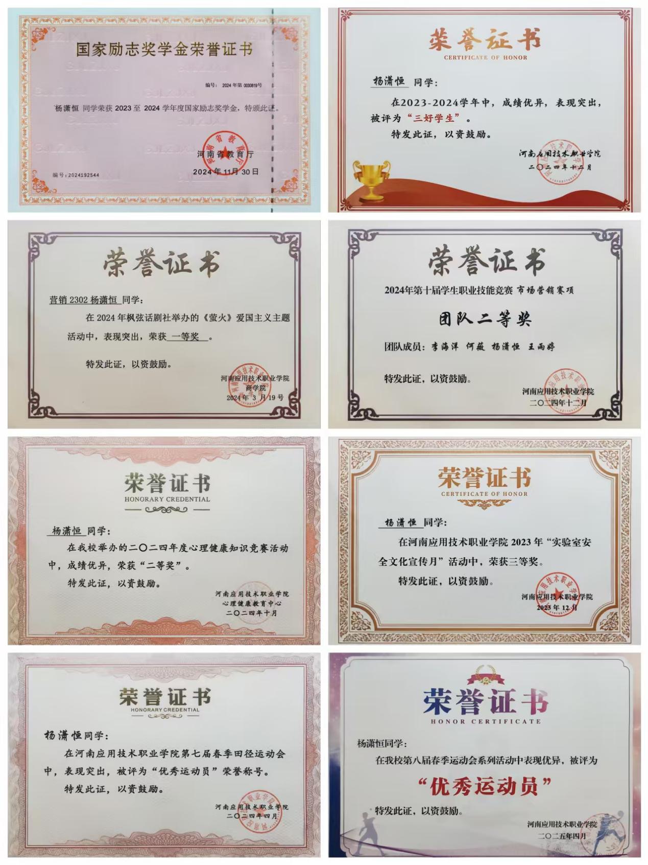 个人简介:杨潇恒,男,2005年3月出生,共青团员,就读于3044永利集团市场营销专业营销2302班员工,辅导员:贺苗苗。在校期间担任班长、员工会主席、营销沙盘社长等。在学习、工作实践中全面发展,先后荣获校三好员工、省三好员工、暑期三下乡优秀个人、国家励志奖学金、“挑战杯”河南省老员工创业计划竞赛银奖等。