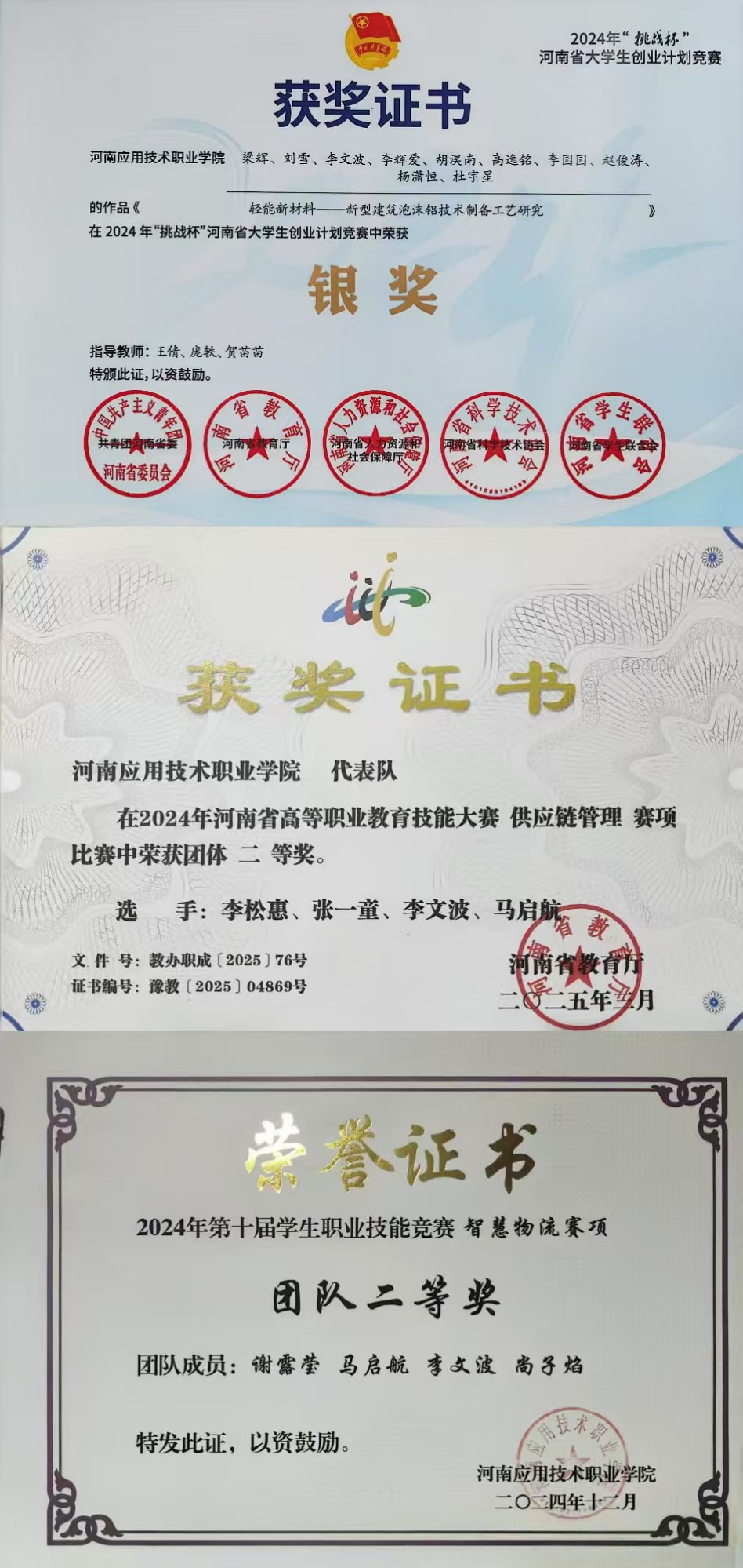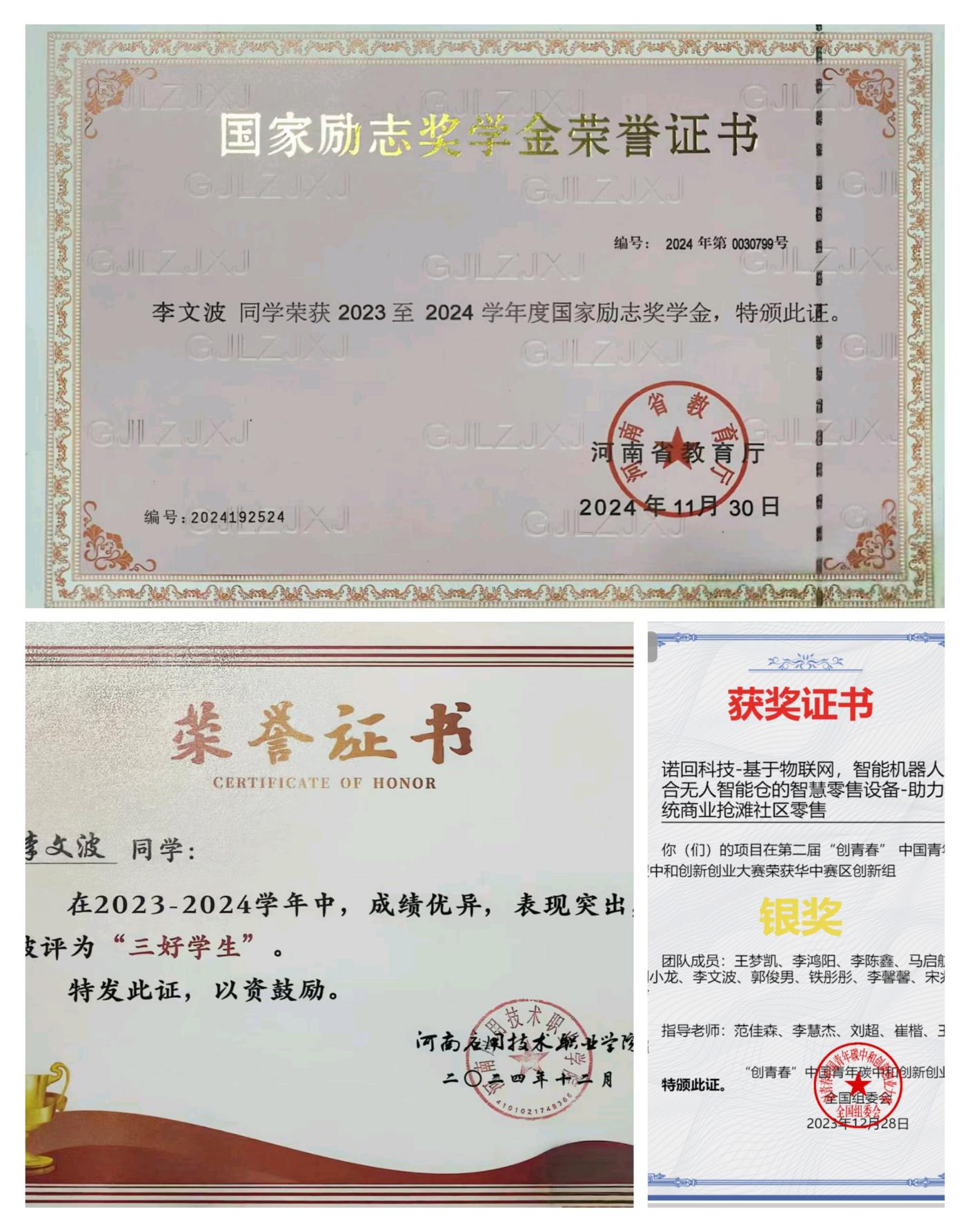 “成功在于积累,进步源于坚持。”李文波始终以严谨认真的态度对待学习,不仅课堂上专注听讲、积极互动,课后还主动拓展知识边界。他密切关注物流行业发展动态,大量研读智慧物流、冷链物流、绿色物流等前沿领域的研究报告与行业资讯,及时掌握行业新技术、新趋势。为提升实操能力,他积极参与公司实训课程,熟练掌握快递分拣、货物扫码入库、装卸搬运、仓储规划等核心物流技能,并顺利考取2023年11月河南省物流职业技能快递运营1+X证书,为职业发展奠定了坚实基础。此外,他深知复合型人才的重要性,利用课余时间自主学习经济学、管理学相关知识,努力构建全面系统的知识体系。凭借优异的学习成绩与突出的综合表现,他先后荣获2024年12月国家励志奖学金、2024年9月校级三好员工、2025年6月“河南省三好员工”等荣誉。