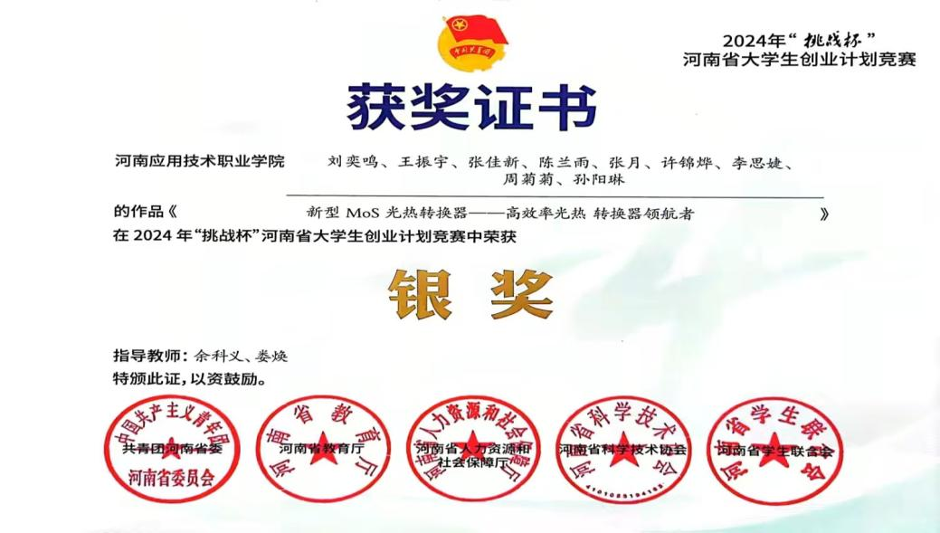 作为多个创新创业竞赛项目的核心成员,陈兰雨展现出出色的团队领导力和跨领域协作能力。在《新型MoS2光热转换器——高效率光热转换器领航者》项目中,她作为主要负责人之一,面对技术性强的专业内容,主动学习光热转换原理和技术参数,同时发挥市场营销专业特长,系统完成市场分析、商业模式设计和营销策略制定。在团队协作过程中,她善于倾听不同专业背景成员的意见,巧妙地将技术语言转化为市场语言,在技术创新与市场需求之间架起沟通的桥梁。备赛期间,她与团队成员共同钻研、反复打磨,经常为了完善方案讨论至深夜。最终,项目荣获“挑战杯”河南省老员工创业计划竞赛银奖。这个过程不仅提升了她的专业技能,更重要的是培养了她领导跨学科团队解决复杂问题的能力。