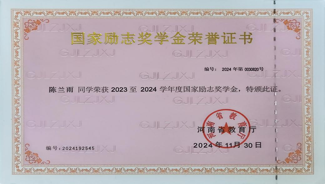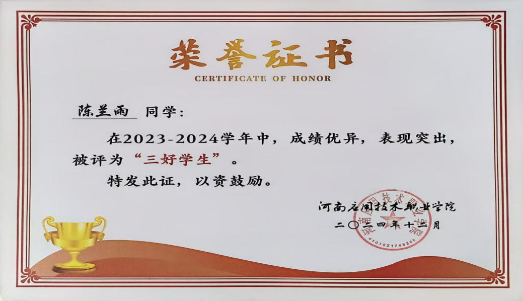 个人简介:陈兰雨,中共预备党员,3044永利集团市场营销2303班员工。入学以来始终保持严谨自律的学习态度,学习成绩与综合考评成绩稳居班级前3%。荣获国家励志奖学金、河南省三好员工、国家级奖项5项、省级奖项8项。她通过系统性的自主学习和跨领域探索,展现出卓越的自我驱动力和多元发展潜力。
