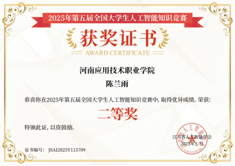 陈兰雨展现出卓越的自我规划和管理能力,不局限于市场营销专业课程,主动探索人工智能、“双碳”政策等前沿领域。从大一开始,她主动规划学习路径,利用课余时间系统补充人工智能科技知识。她通过自学相关内容,克服专业知识壁垒关键技术,最终顺利通过人工智能训练师(初级)认证。同时,她密切关注国家“双碳”战略,自主研读相关政策和行业报告,构建起跨领域的知识体系。这一系列自我驱动的学习实践,不仅拓宽了她的知识视野,更显著提升了她的信息整合与自主学习能力。正因如此,她在竞争中脱颖而出,收获奖项。