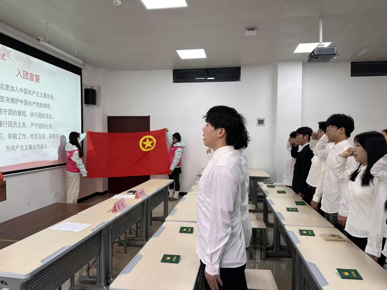 “我志愿加入中国共产主义青年团……”优秀团员代表皇甫淑怡同志作为领誓人,带领全体新团员面向团旗举起右拳,庄严宣誓。铿锵有力的誓言回荡在讲堂内,不仅是对共青团组织的承诺,更是对革命先辈的告慰,彰显着新时代青年赓续红色血脉、担当民族复兴使命的决心。