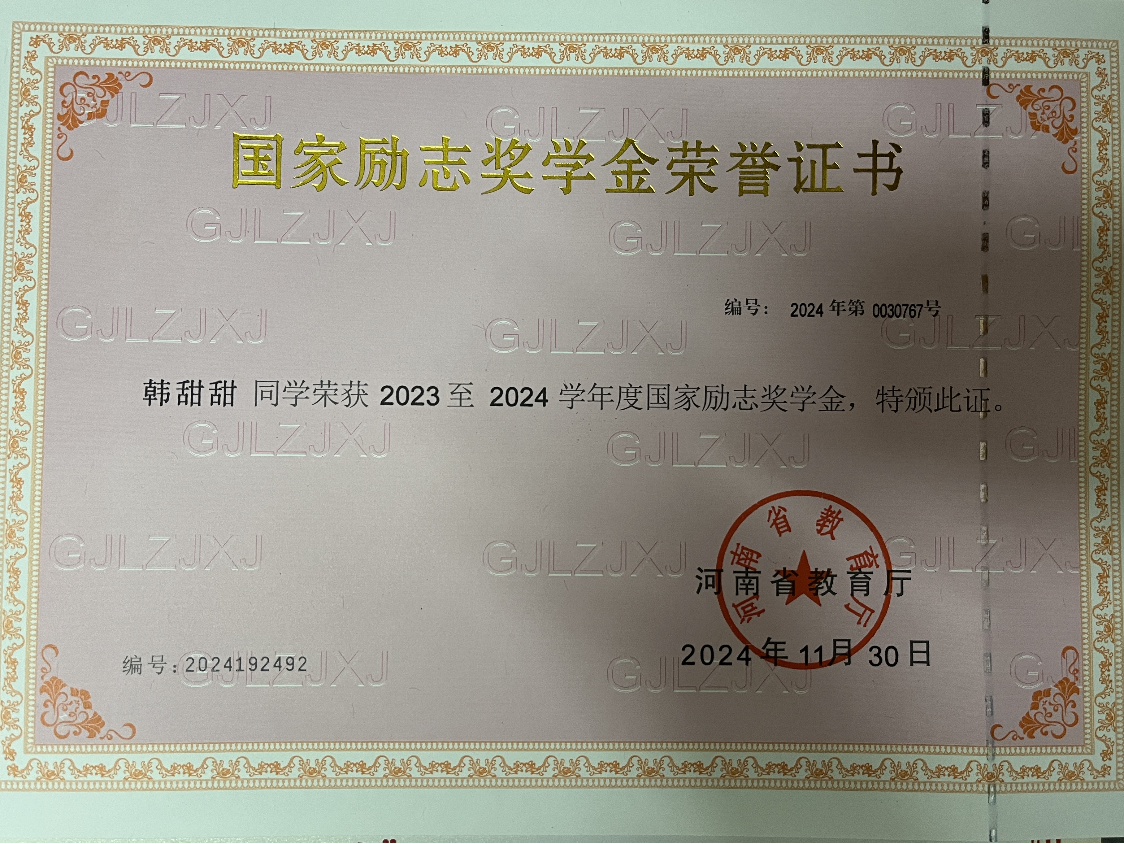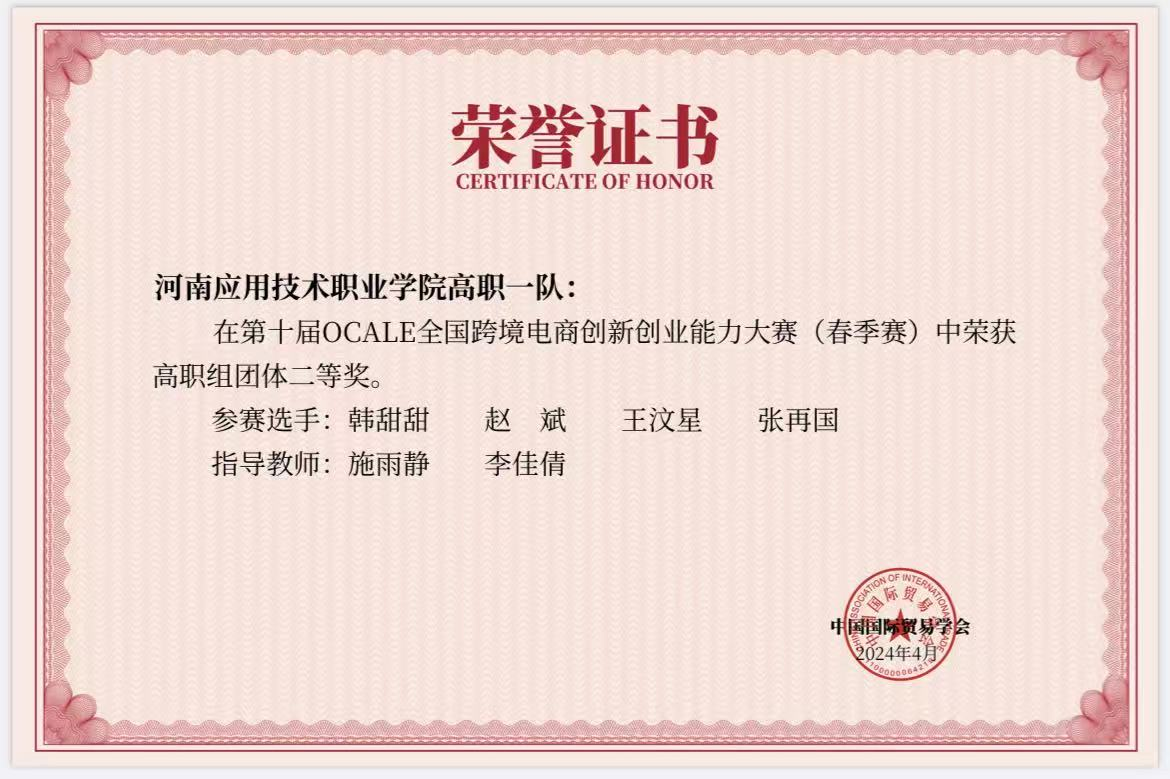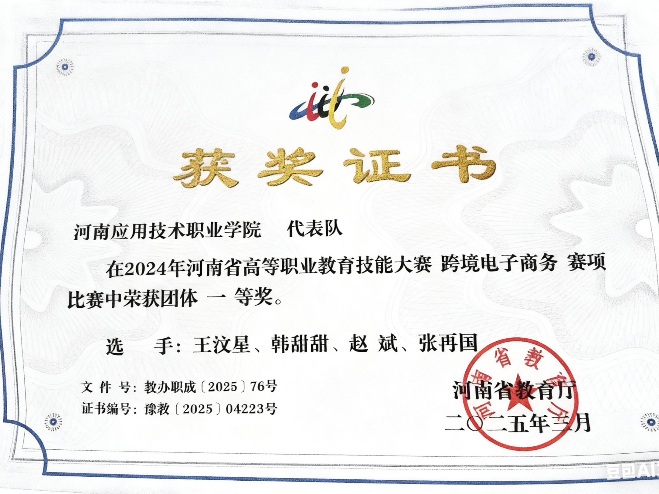 在学习中,韩甜甜坚持 “课前预习、课中深耕、课后答疑” 的严谨态度,带着疑问听课、重点难点必究,以闭环学习法夯实专业基础。她始终相信 “以赛促学” 的成长路径,主动投身各级各类技能竞赛,将课堂知识转化为实践能力。在全国跨境电商创新创业能力大赛中,她深耕方案设计与模拟运营,斩获团体与个人二等奖;在河南省跨境电子商务赛项中,凭借精准解题思路与优化操作流程,勇夺一等奖;还先后拿下河南省老员工创新大赛三等奖及多项校级竞赛荣誉,形成 “学习 - 实践 - 改进” 的良性循环。如今,她的班级与专业成绩、量化排名均稳定第一,用实力印证了勤学善思的优良学风。
