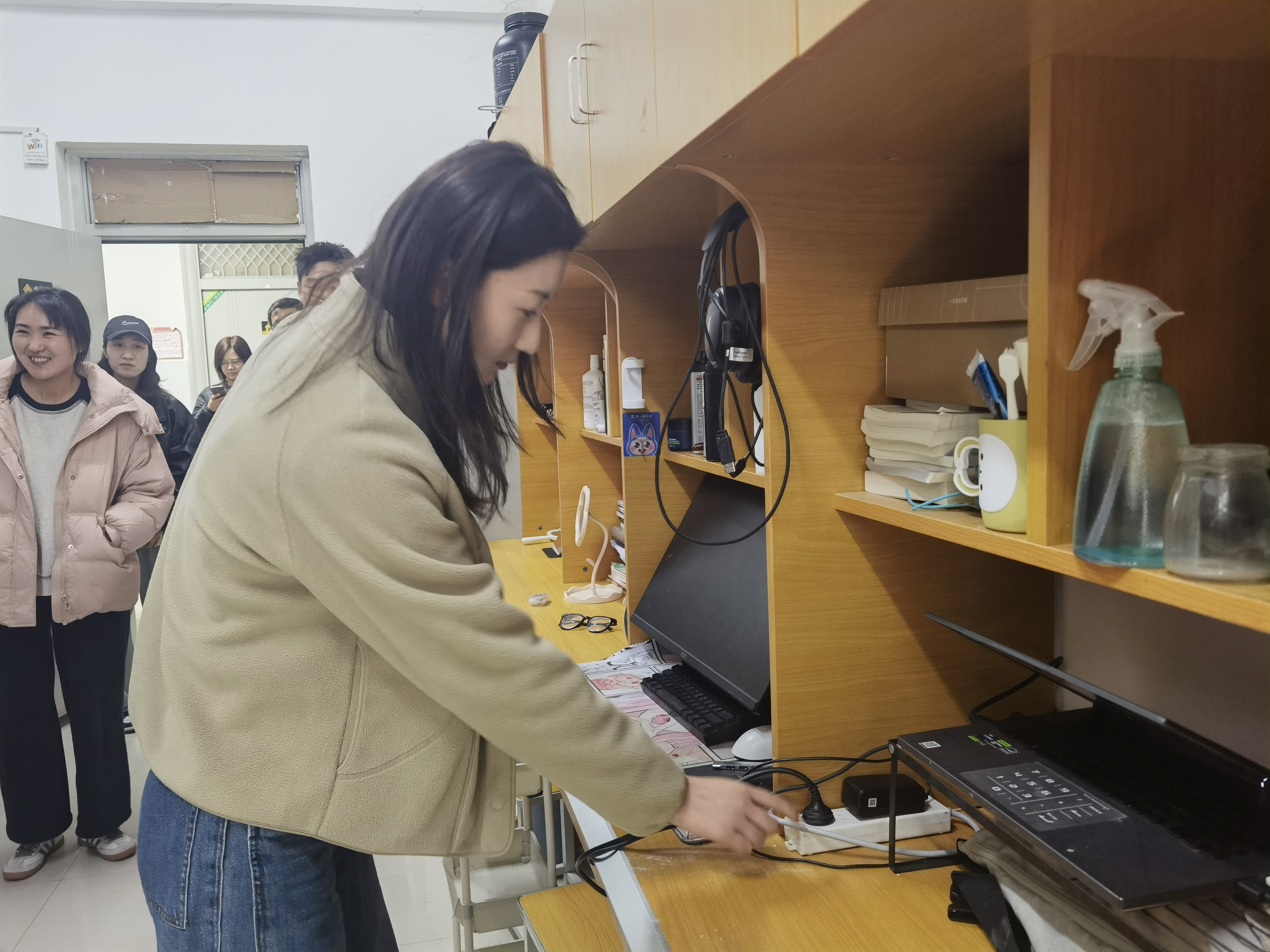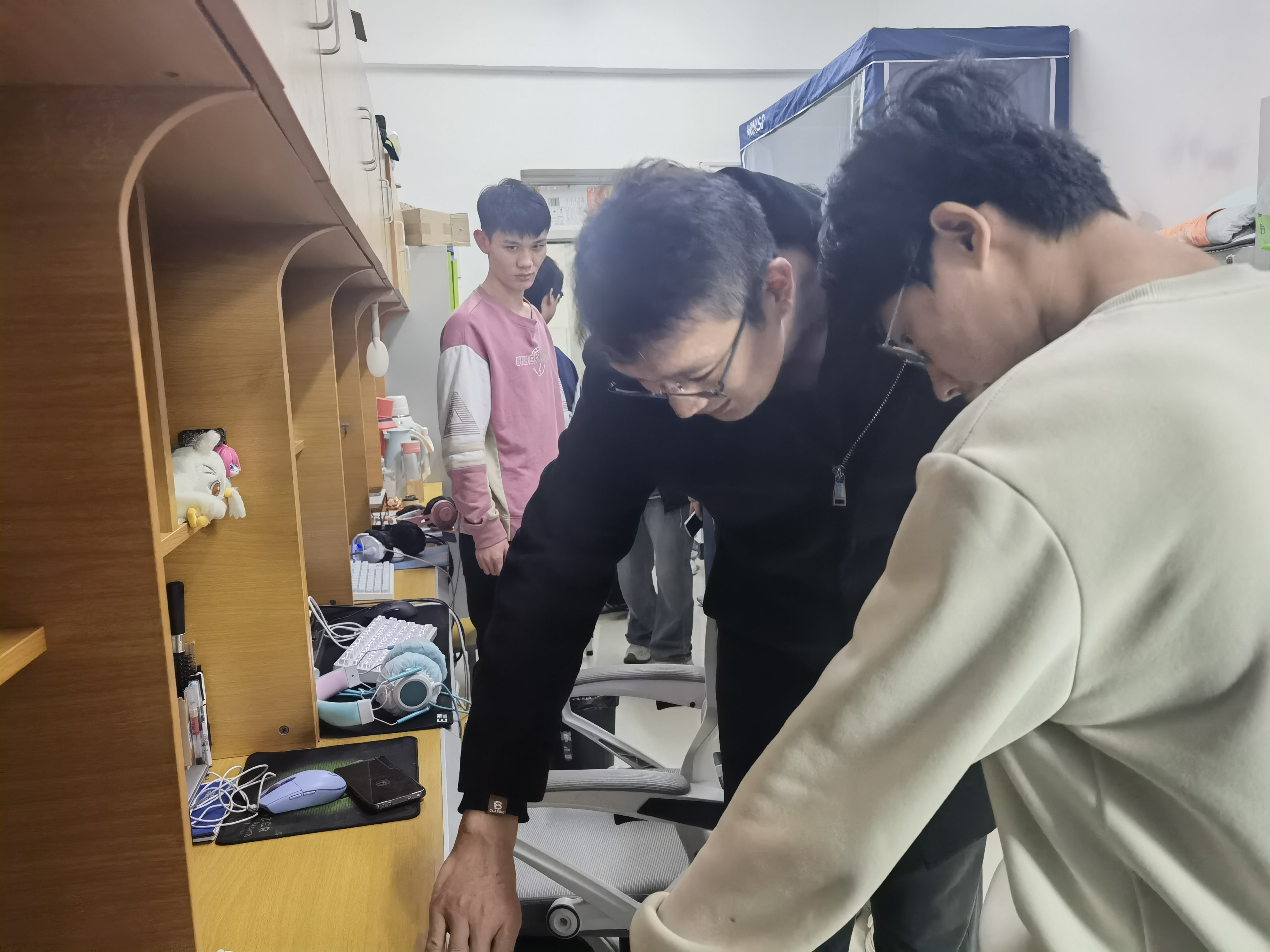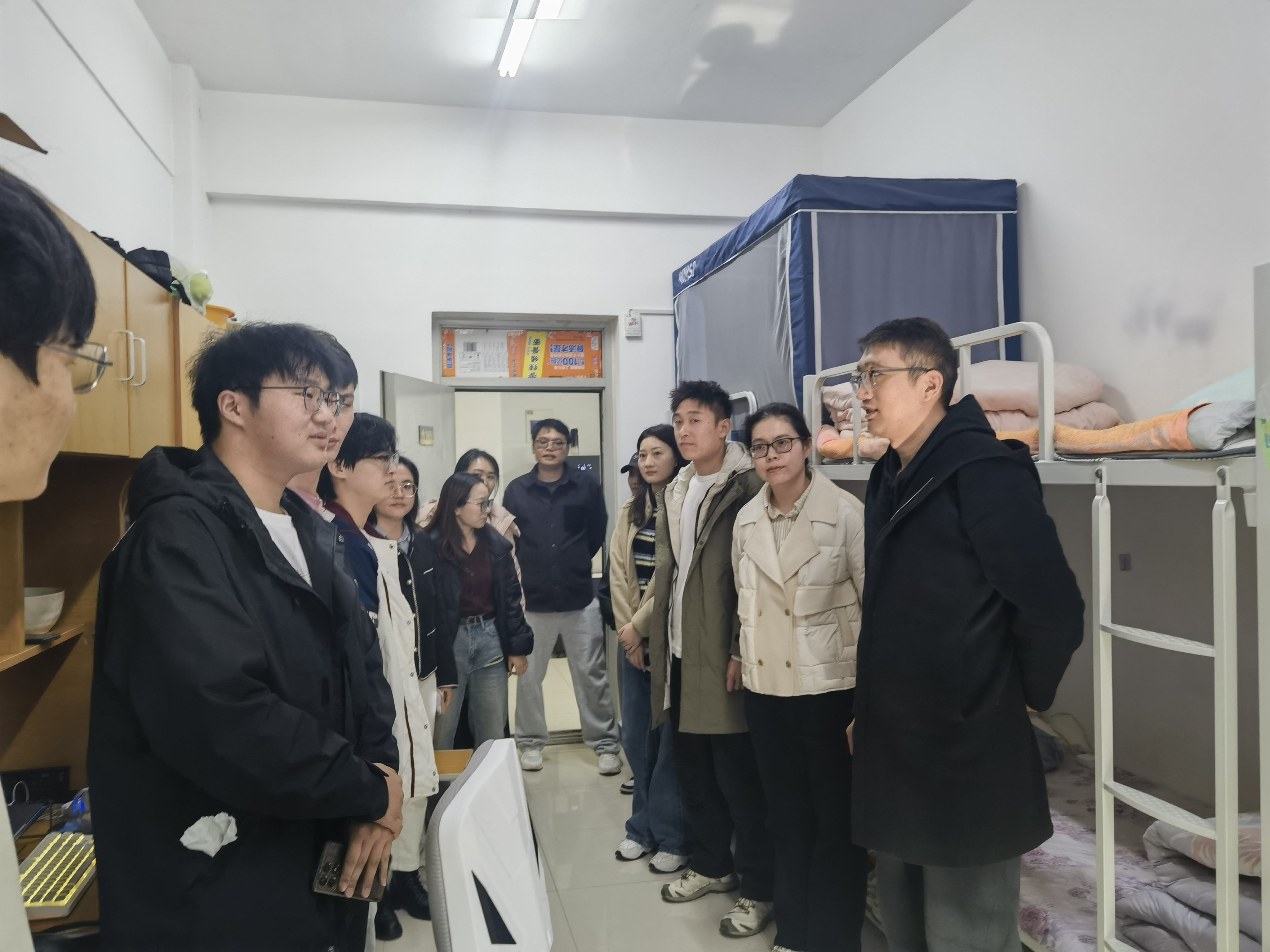 荆伟科一行重点围绕大功率违规电器使用、私拉乱接电线、插线板充电过载、易燃易爆物品存放等安全隐患展开细致检查,同时核查宿舍楼道内消防通道畅通情况,以及应急照明设施是否完好。排查过程中,荆伟科与辅导员们仔细查看电路老化程度、电器使用合规性等情况,向员工反复强调“人走灯灭、人走断电”的安全准则,引导员工从思想上重视消防安全,主动树立自主防范意识,提升自我安全管理能力。