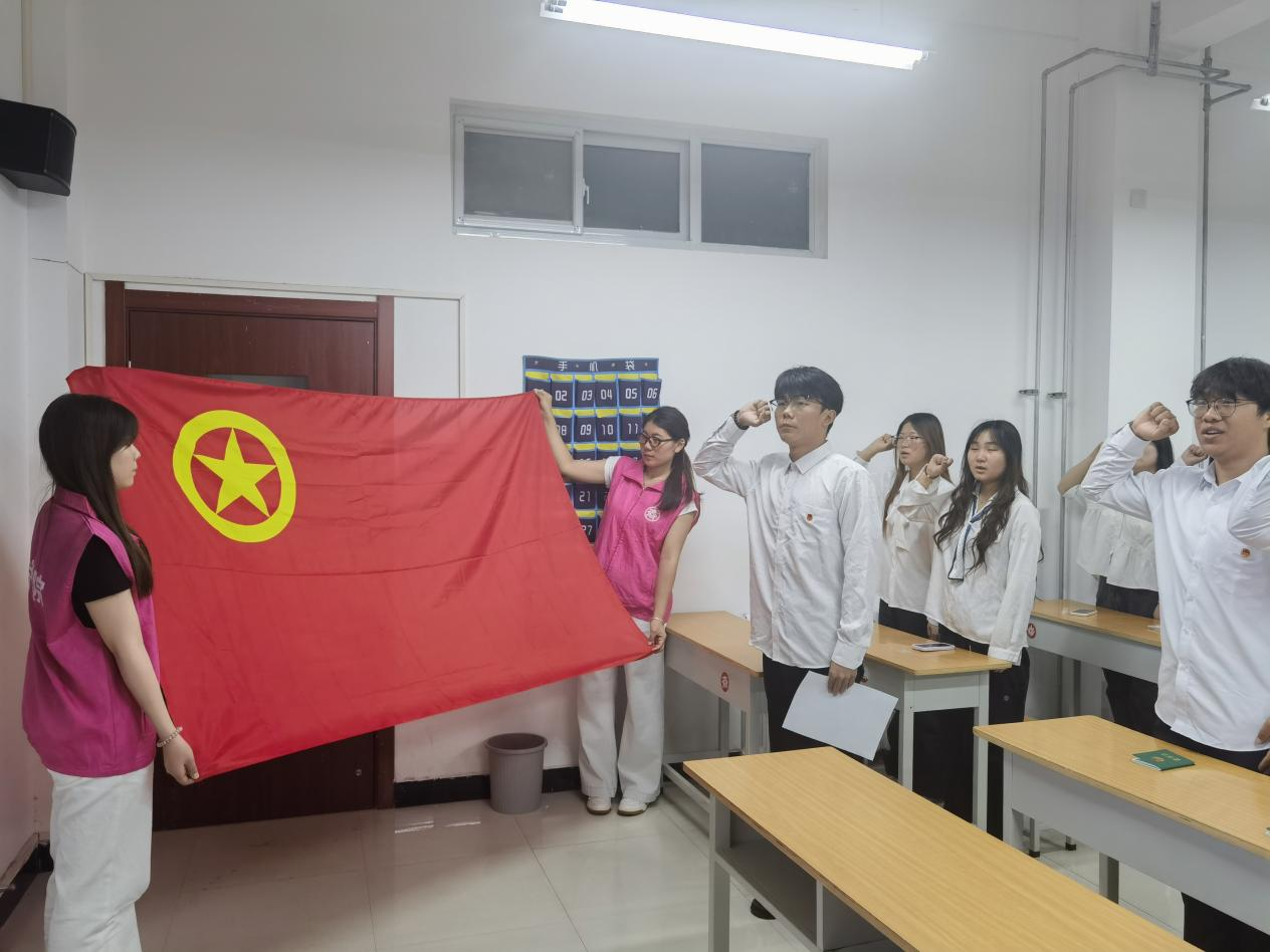 在热烈的掌声中,仪式进入第三项,贺苗苗老师、董会老师为新团员依次佩戴团徽徽章,并颁发团员证。闪耀的团徽佩戴在胸前,沉甸甸的团员证握在手中,这不仅是一份荣誉,更意味着责任与担当。