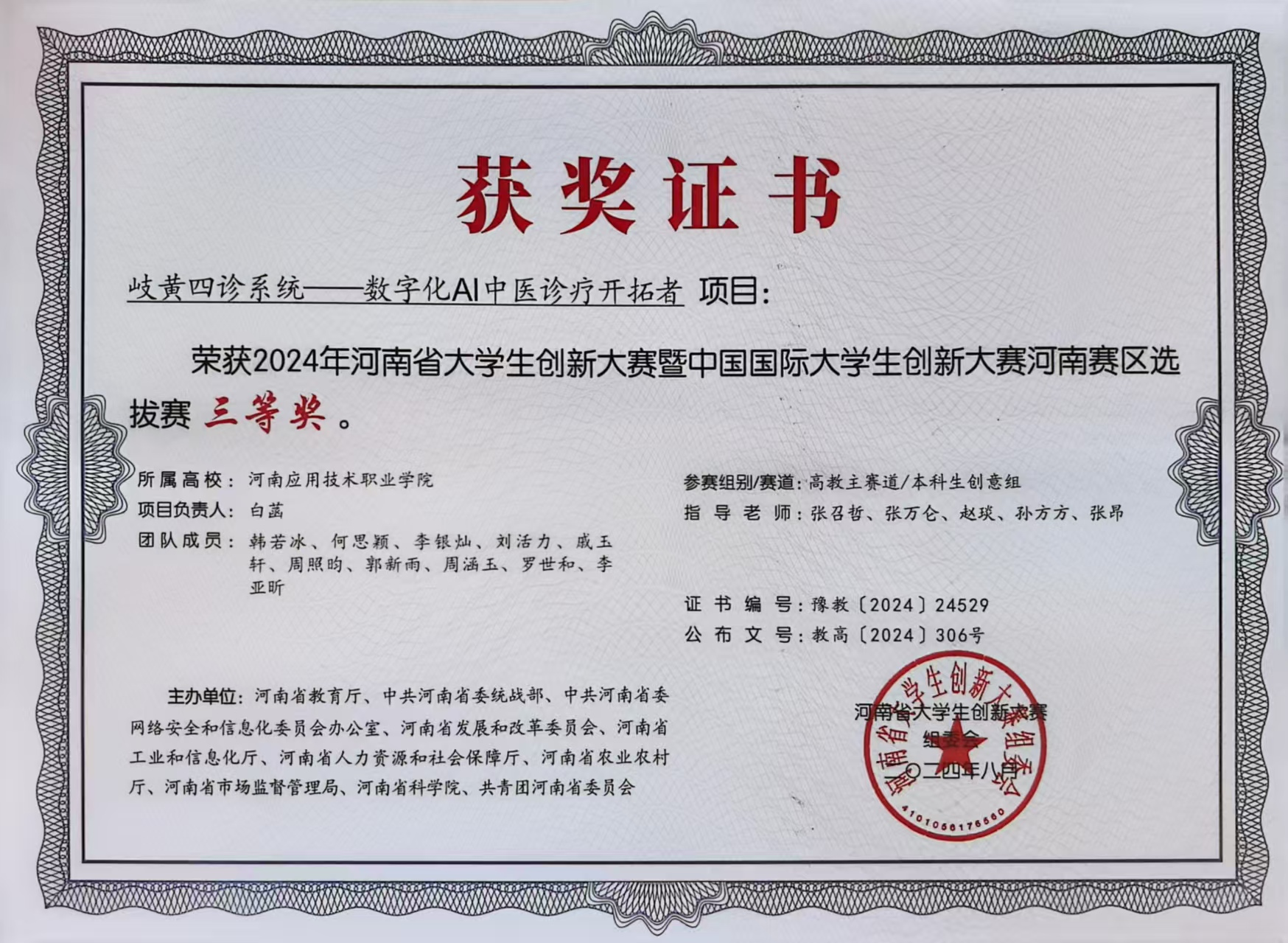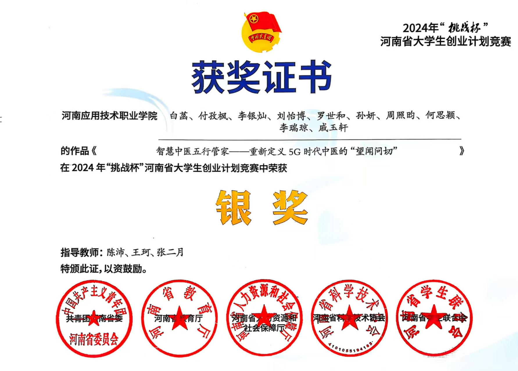 在创新创业与职业技能竞赛的赛道上,白菡始终以“立足实际、解决问题”为导向,勇于跨界探索、突破自我,凭借扎实的专业知识与创新思维屡获佳绩。2024年暑假,为备战“挑战杯”河南省老员工创业计划竞赛,她主动放弃假期休息,与团队成员留校打磨《智慧中医五行管家——重新定义5G时代中医的“望闻问切”》项目。作为核心成员,她结合物流专业的流程优化思维与中医健康管理的实际需求,先通过查阅行业文献、分析中医健康服务市场报告,明确项目的市场定位;随后走进社区卫生服务中心、中医馆,与执业医师、就诊患者面对面交流,收集多条关于中医诊疗流程、健康管理需求的真实反馈。她将这些多渠道收集的信息分类梳理,结合物流行业的供应链管理逻辑,优化项目的服务流程与运营模式,最终助力团队凭借贴合市场需求的创新思路斩获省级银奖。