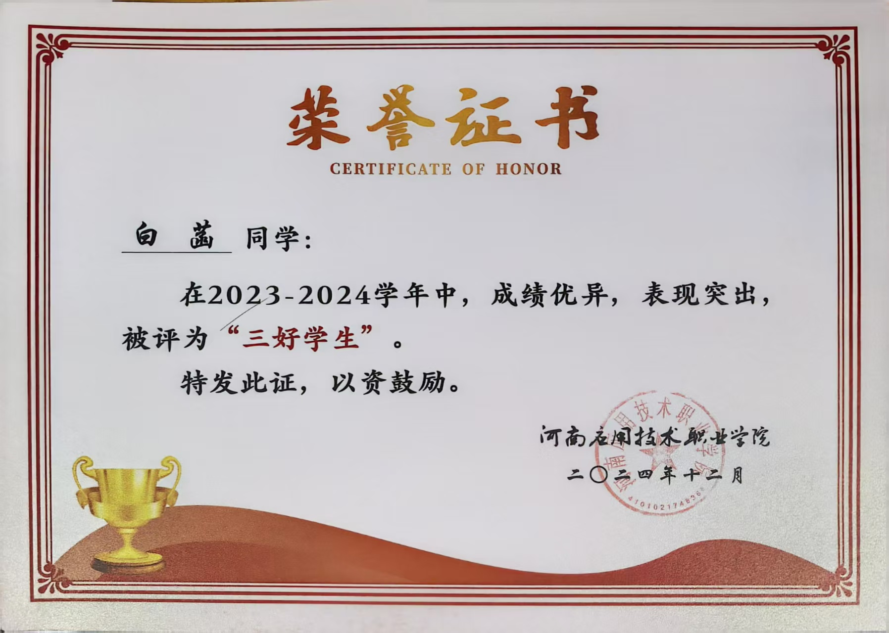 推荐理由:该同学理想信念坚定,积极向党组织靠拢,政治理论素养与思想道德水平突出;专业基础扎实,学习方法科学高效,成绩稳居专业前列;创新实践能力强劲,在创新创业与职业技能竞赛中屡获省级荣誉;热心服务集体、奉献社会,积极参与志愿服务与校园活动,兼具学识、能力与担当,其“知不足而奋进,望远山而前行”的成长历程极具示范意义。