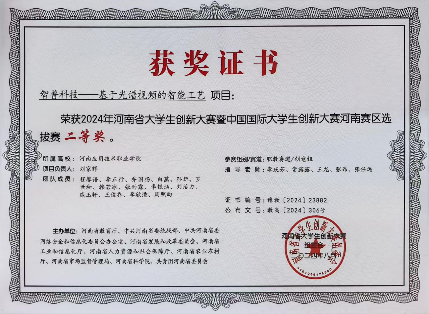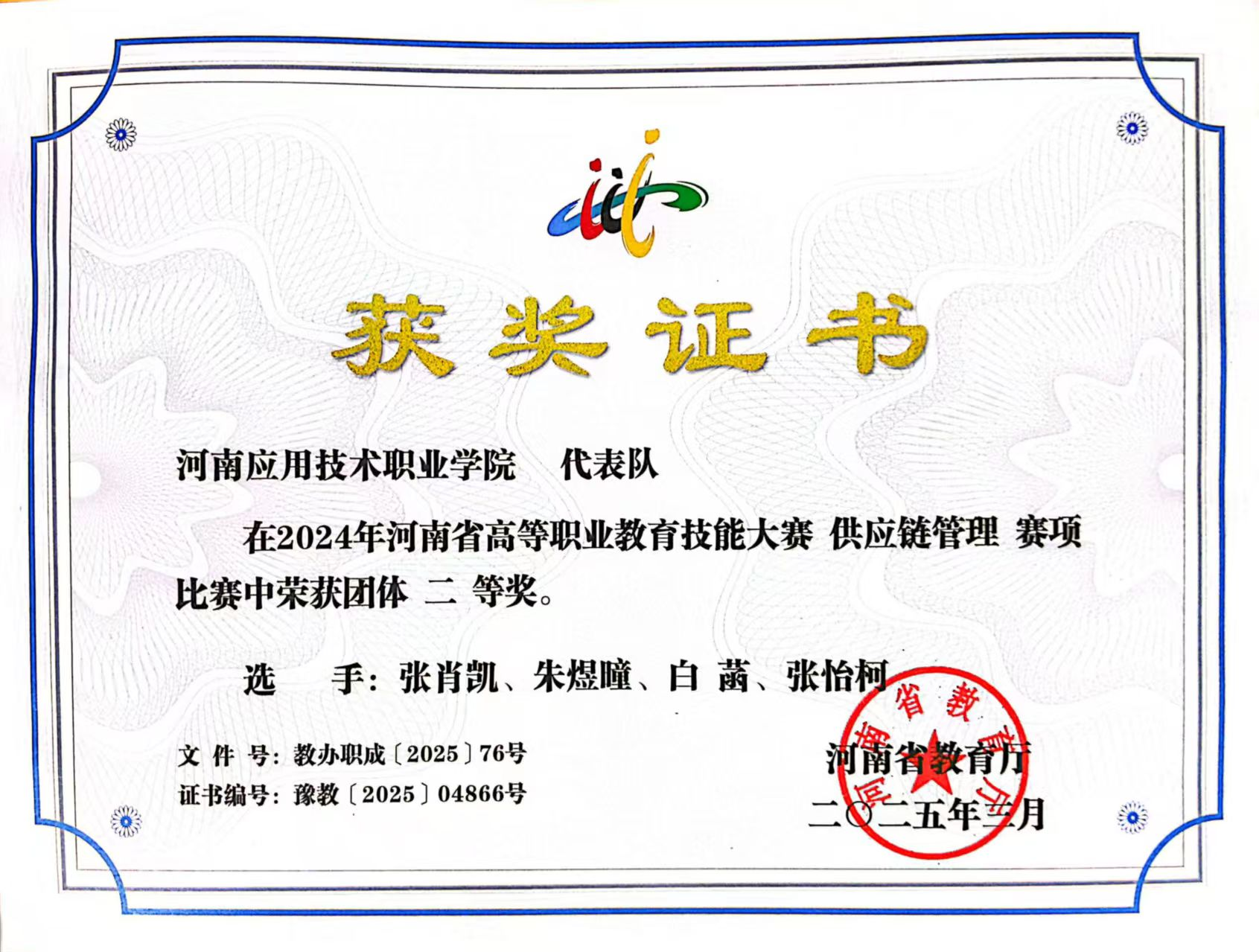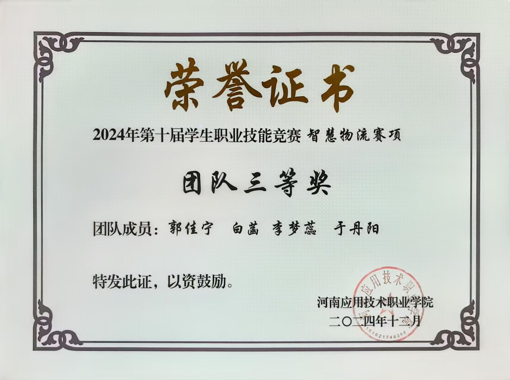 在职业技能竞赛中,她同样稳步前行、表现亮眼。2024年,她与团队成员组队参与第十届员工职业技能竞赛智慧物流赛项,备赛期间,他们充分利用公司实训资源,反复模拟仓储布局规划、货物分拣调度、物流系统操作等竞赛环节,针对实操中的薄弱点集中强化训练,通过分工协作、默契配合弥补各自短板,最终荣获团队三等奖。此外,她还于2024年10月参与河南省高校实验室安全知识与技能大赛,赛前系统学习实验室安全规范、危险品管理、应急处置等知识,结合物流实训中的安全操作经验强化练习,最终凭借扎实的知识储备与规范的实操表现顺利通过考核,获得合格证书。