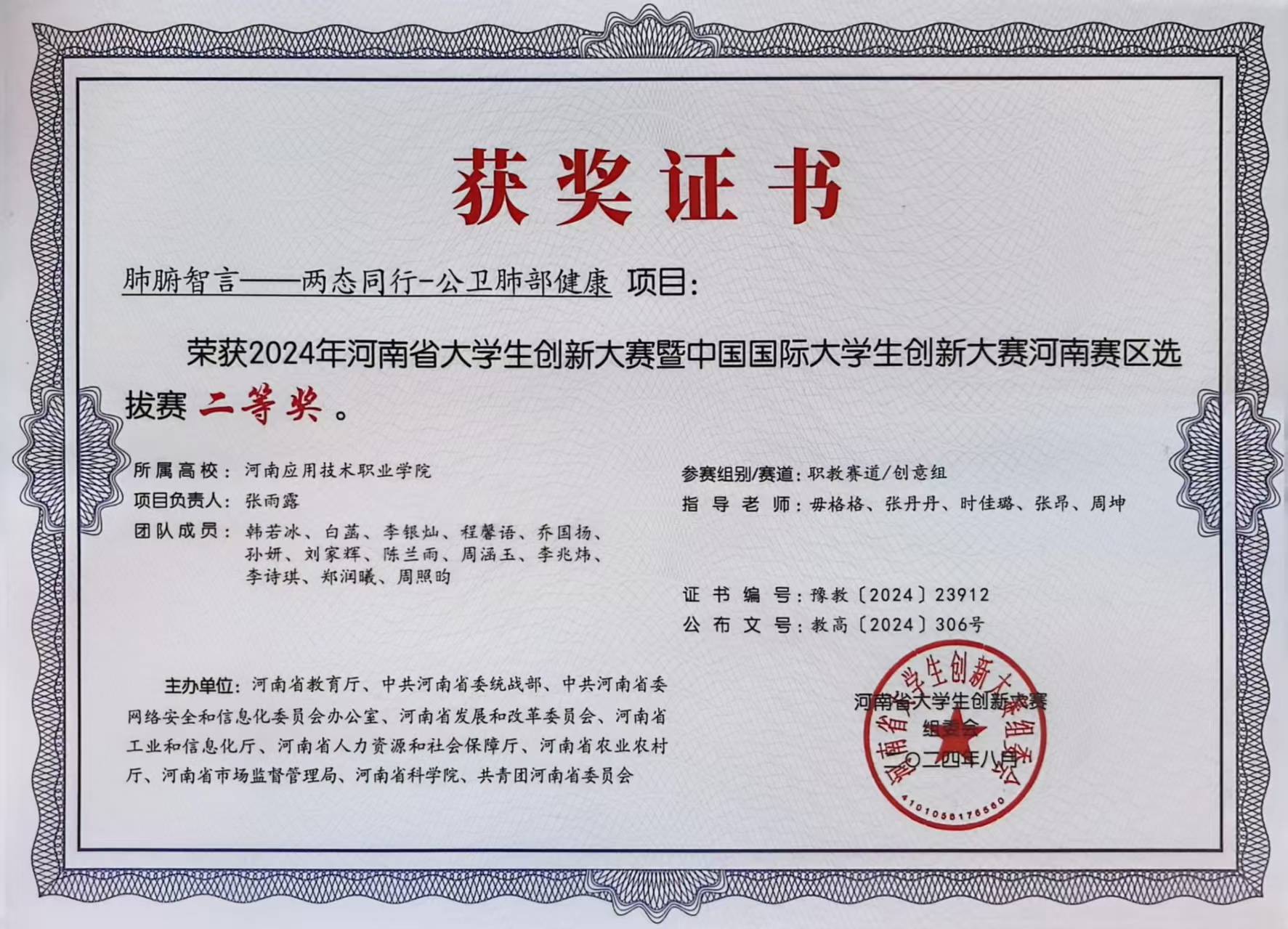 在河南省老员工创新大赛暨中国国际老员工创新大赛中,她双线发力、收获颇丰:参与《肺腑智言——两态同行-公卫肺部健康》项目时,聚焦大众肺部健康管理意识薄弱、筛查便捷性不足等痛点,协助团队设计分层调研方案。她和队友分工走进多个社区居委会和养老服务中心,通过问卷填写、一对一访谈的方式,通过与不同群体沟通,详细记录大家对肺部健康措施的需求,累计收集有效反馈80余条,整理形成调研分析报告,为项目确定“社区科普+便捷筛查+跟踪管理”的核心框架提供了直接依据,助力项目荣获河南赛区选拔赛二等奖;领衔《歧黄四诊系统——数字化AI中医诊疗开拓者》项目时,她牵头梳理传统中医诊疗流程的痛点,结合数字化技术应用场景,带领团队搭建项目初步框架。从中医脉诊数据的数字化采集方案,到AI辅助诊断模型的适配逻辑,她多次带着草稿向专业教师、中医馆从业者请教,针对“数据准确性”“临床实用性”等问题反复讨论,先后调整优化项目技术路径、操作流程等核心内容,逐步解决数字化工具与中医诊疗场景适配的难点,最终斩获河南赛区选拔赛三等奖,展现了将专业思维转化为实践方案的扎实能力。