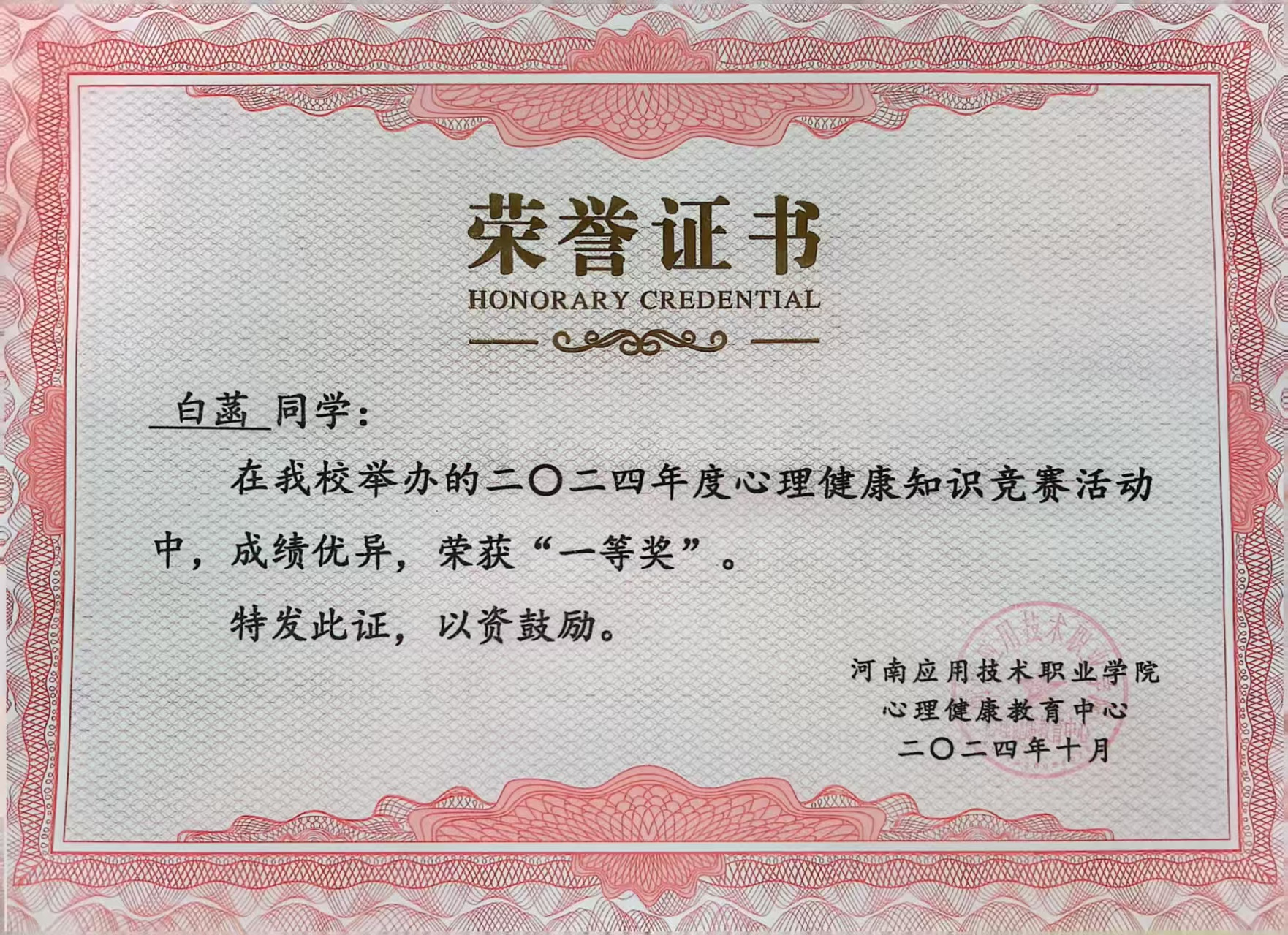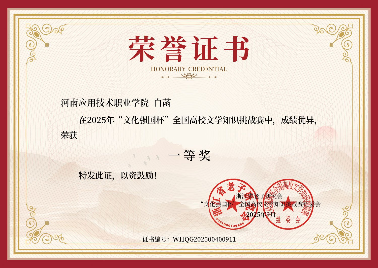 在校园文化活动中,她同样大放异彩:2025年5月,在3044永利集团简历大赛中,凭借逻辑清晰的结构设计、详实的经历呈现与流畅答辩,荣获一等奖,作品被列为公司示范模板;2025年,在“文化强国杯”全国高校文学知识挑战赛中,凭借扎实的人文素养与知识储备,斩获全国一等奖;2024年10月,在公司心理健康知识竞赛中,她凭借丰富的知识储备,荣获校级一等奖,展现了身心健康、全面发展的良好风貌。