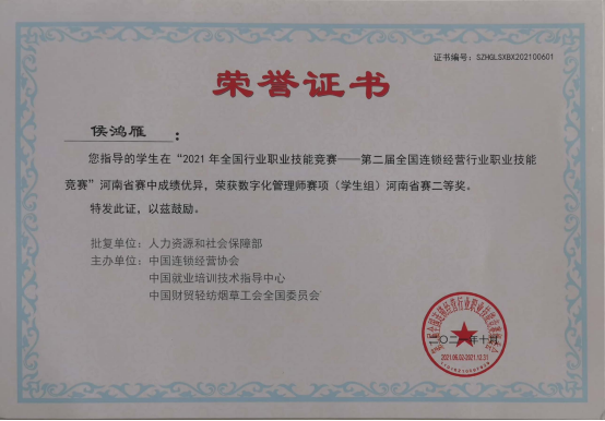 2021年连锁经营管理师省级二等奖1项、三等奖1项