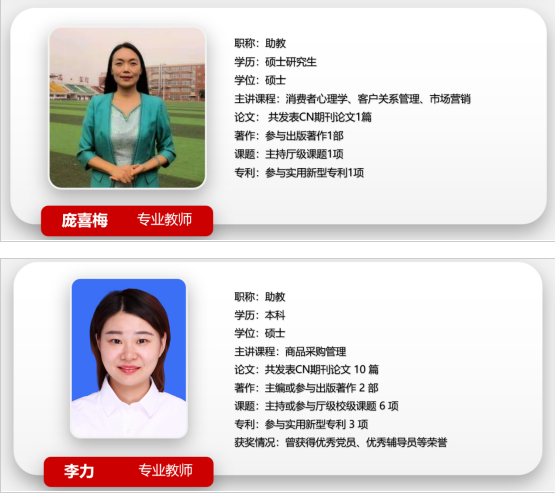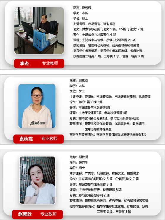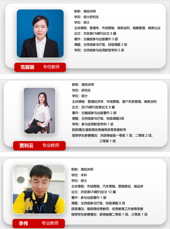 市场营销专业共有教师15人,其中专任教师10人,副教授3人,讲师11人,“双师型”教师10人,是一支年轻、充满活力与创新精神的团队。
