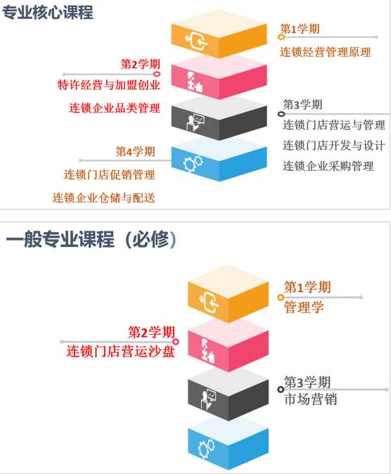 本专业核心专业课程包括:连锁经营管理原理、特许经营与加盟创业、连锁企业门店营运与管理、连锁企业采购管理、连锁门店开发与设计、连锁企业品类管理、连锁门店促销管理、连锁企业仓储与配送。一般专业课程包括:管理学、连锁门店营运沙盘、市场营销、经济学基础、连锁企业人力资源管理、电子商务概论、中国商贸文化、商务礼仪、消费者行为学、经济法、顶(跟)岗实习等。其中管理学、连锁门店营运沙盘、市场营销、经济学基础、连锁企业人力资源管理等课程、顶(跟)岗实习为必修,电子商务概论、中国商贸文化、商务礼仪、消费者行为学、经济法等课程为限定选修课。