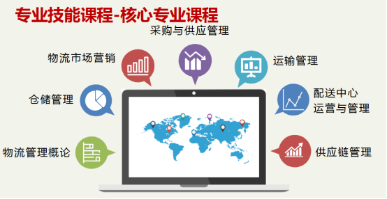 具有物流管理概论、仓储管理、运输管理、采购与供应管理、供应链管理、配送中心运营管理、国际货代、物流市场营销等专业核心课程,以及管理学、物流设施设备认知、物流信息系统操作、储配方案设计、商品包装实务、快递操作实务、国际货代、物流经济学、物流企业法规、中国商贸文化、商务礼仪、电子商务概论、冷链物流等一般专业课程。